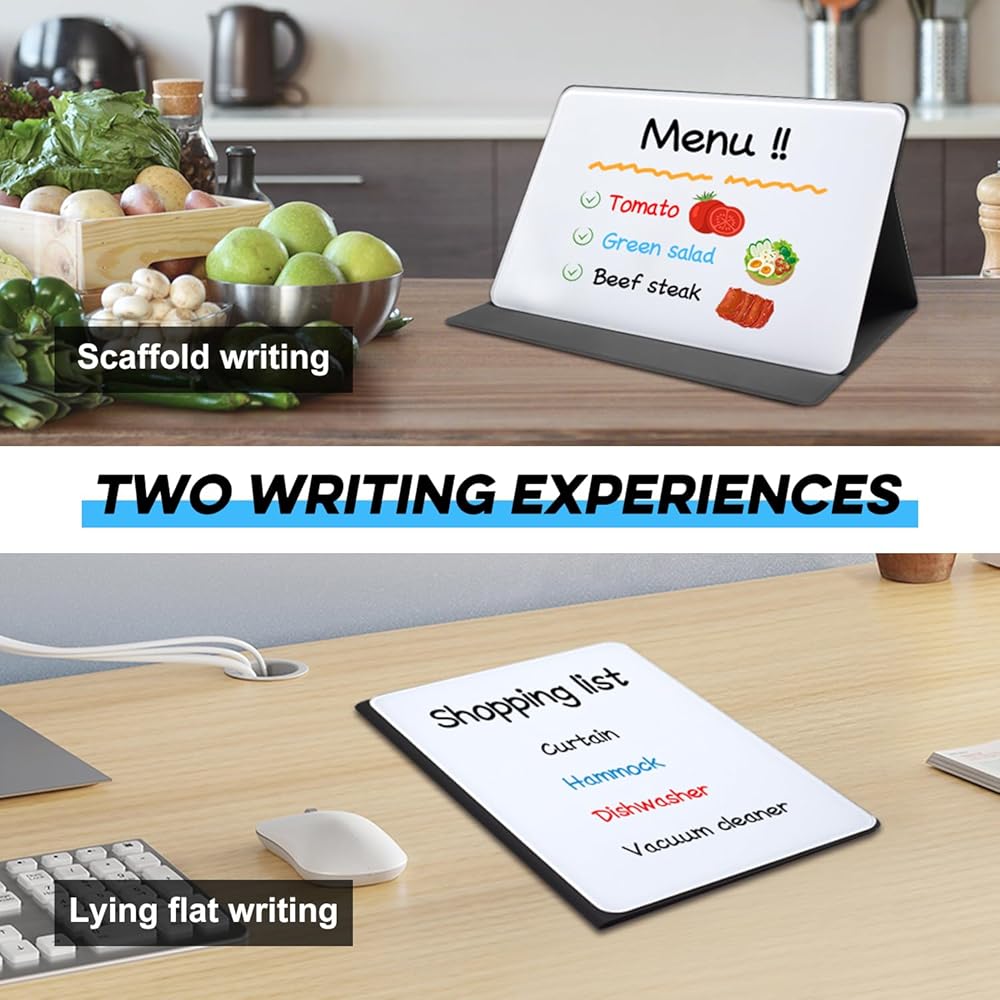 • FOLDABLE COVER: Keep your workspace neat and your whiteboard protected with the foldable PU leather cover. This glass desktop whiteboard is always within reach for those urgent thoughts and quick reminders you need to get down fast.