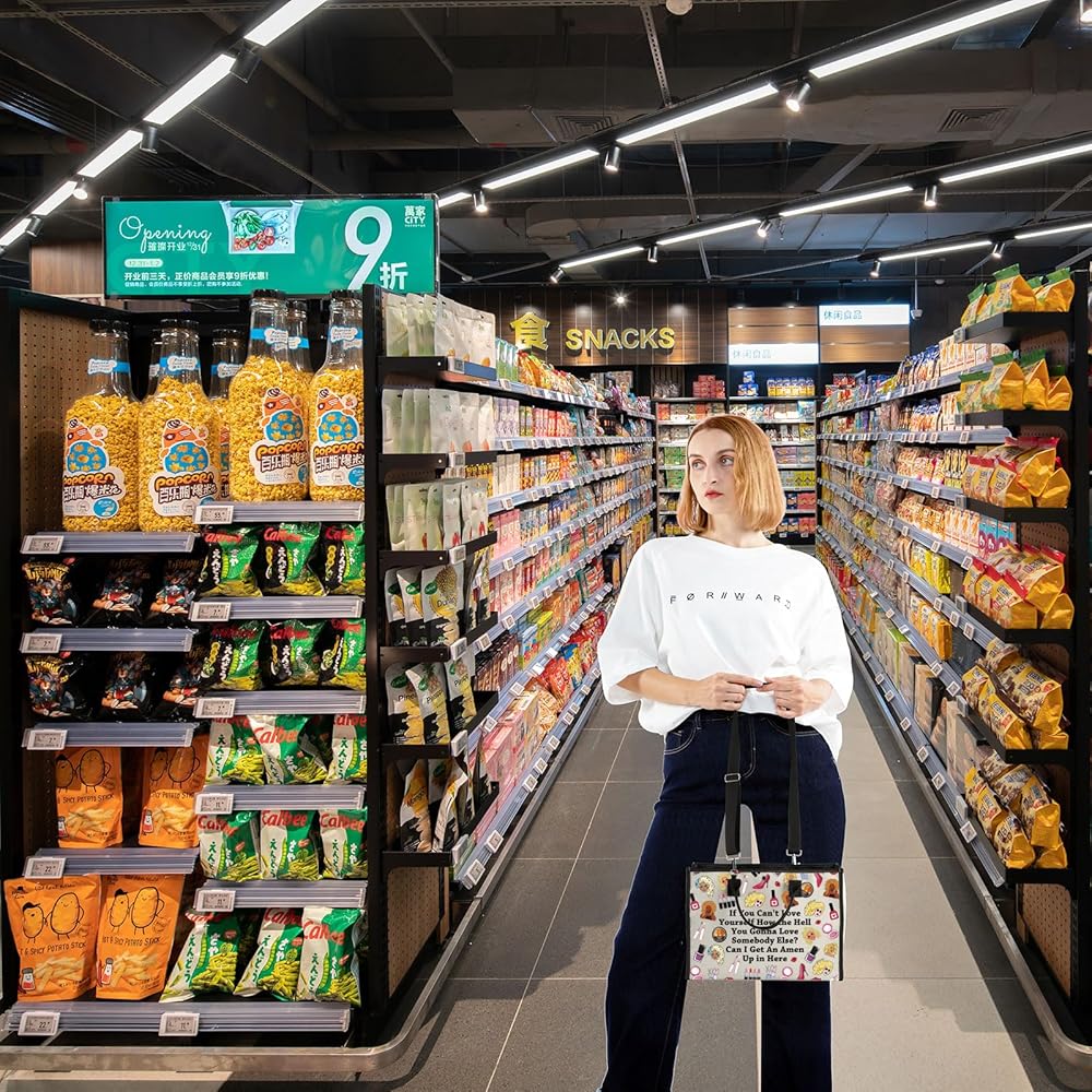 • حقيبة اليد القابلة لإعادة الاستخدام هذه كبيرة ومتينة بما يكفي لحمل محفظتك أو مجلداتك أو جهازك اللوحي أو الكمبيوتر المحمول الصغير، ومتعددة الاستخدامات للاستخدام في مناسبات مثل العمل أو التسوق في البقالة أو صالة الألعاب الرياضية أو السفر أو الشاطئ أو عطلة نهاية الأسبوع.