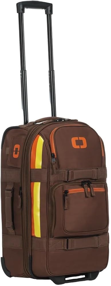 Custom in-line skate wheels and locking retractable handle provide optimum mobility. Internal compression straps. Two low profile external pockets. Custom OGIO ID sleeve. Multiple grab handles. Airline regulation carry-on size with 3in expansion zipper (must be checked when expanded).