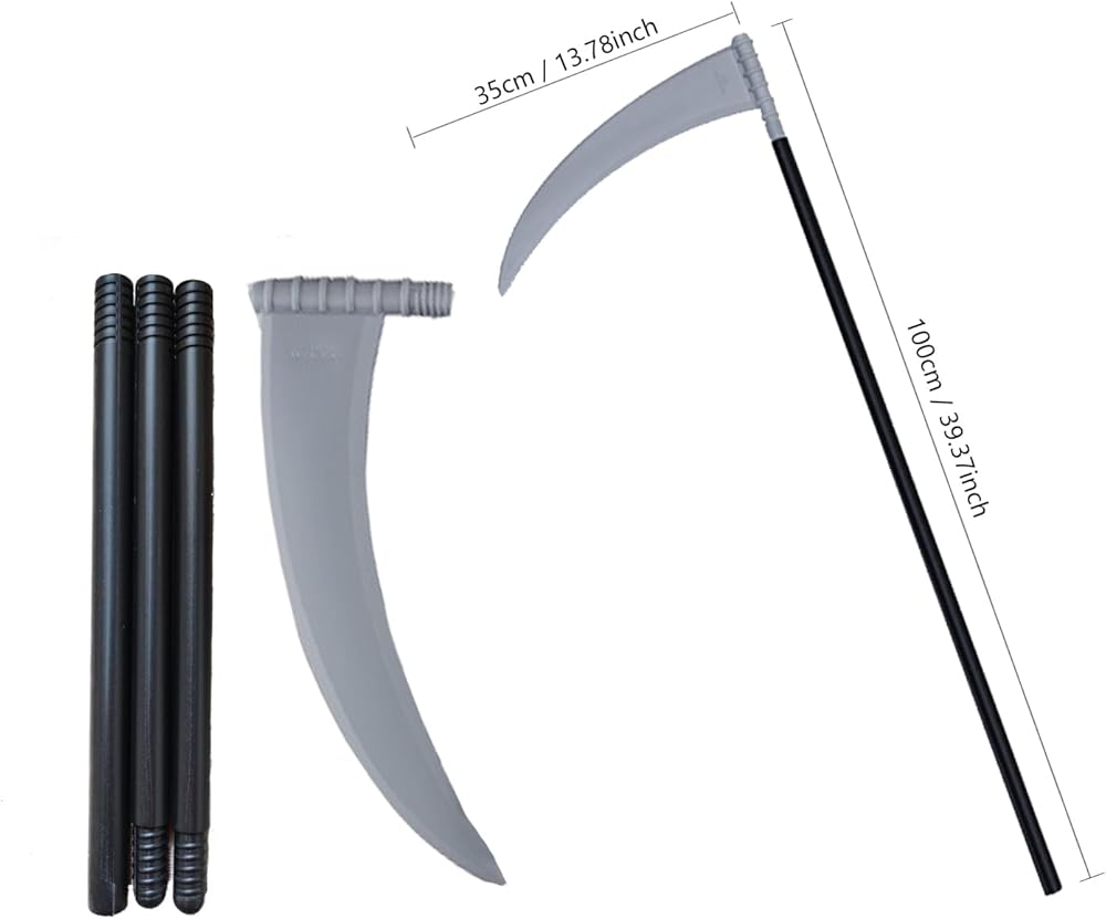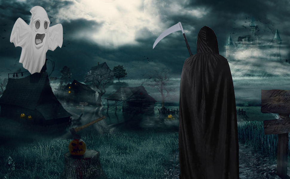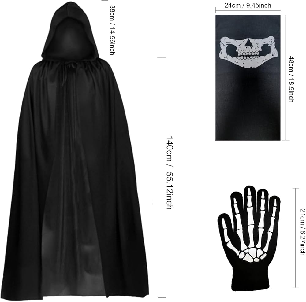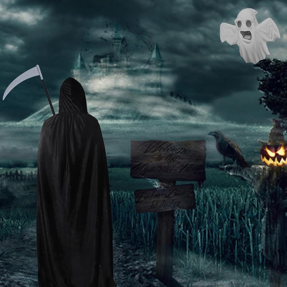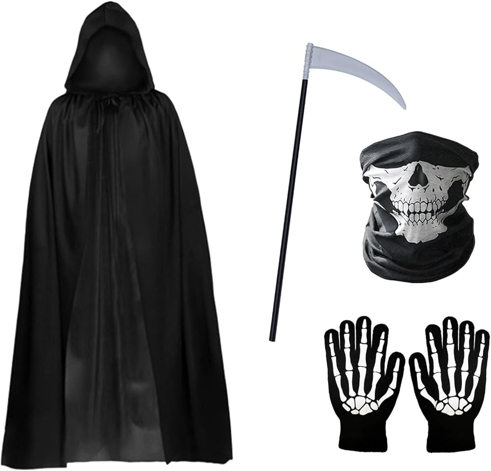 • زي مخيف: مجموعة زي حاصد الأرواح هذه مثالية للهالوين أو المناسبات التنكرية. تتضمن عباءة سوداء بغطاء للرأس، وهيكل عظمي لقناع الجمجمة، ومنجل حاصد الأرواح، وقفازات.