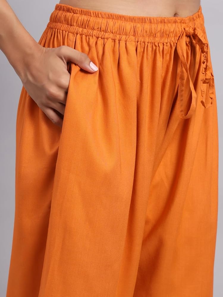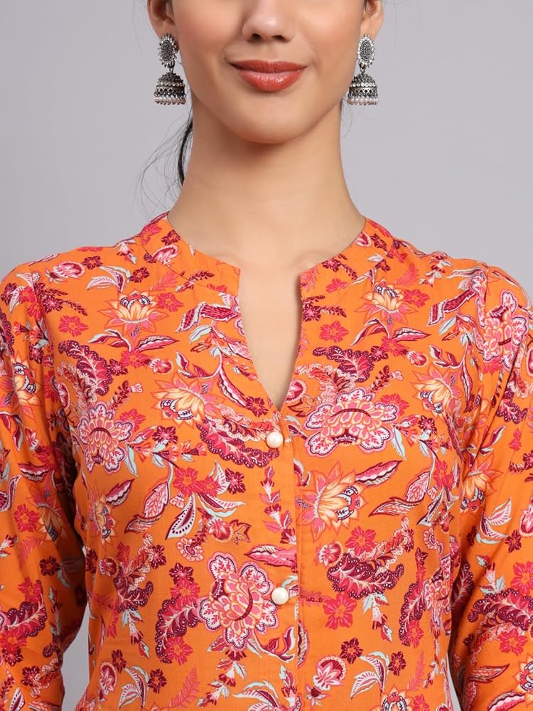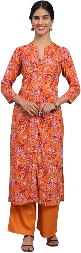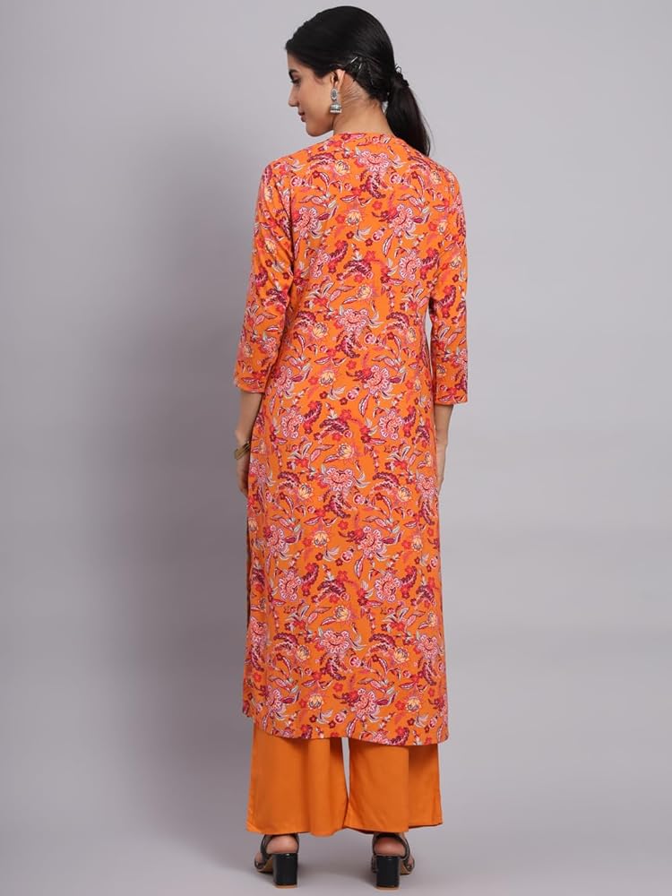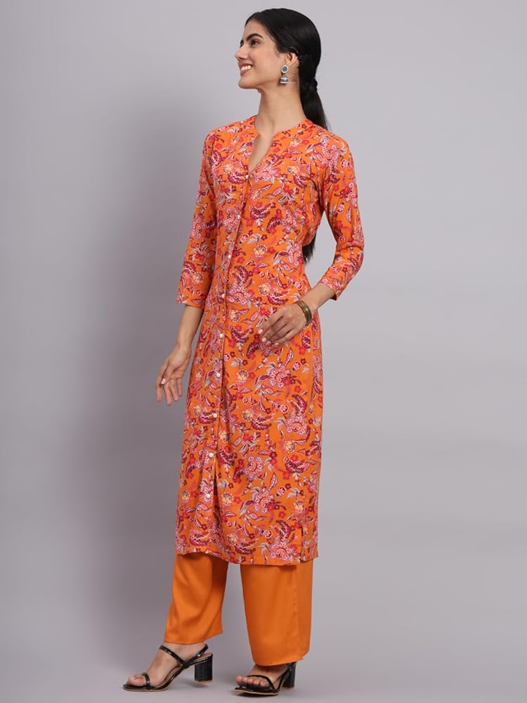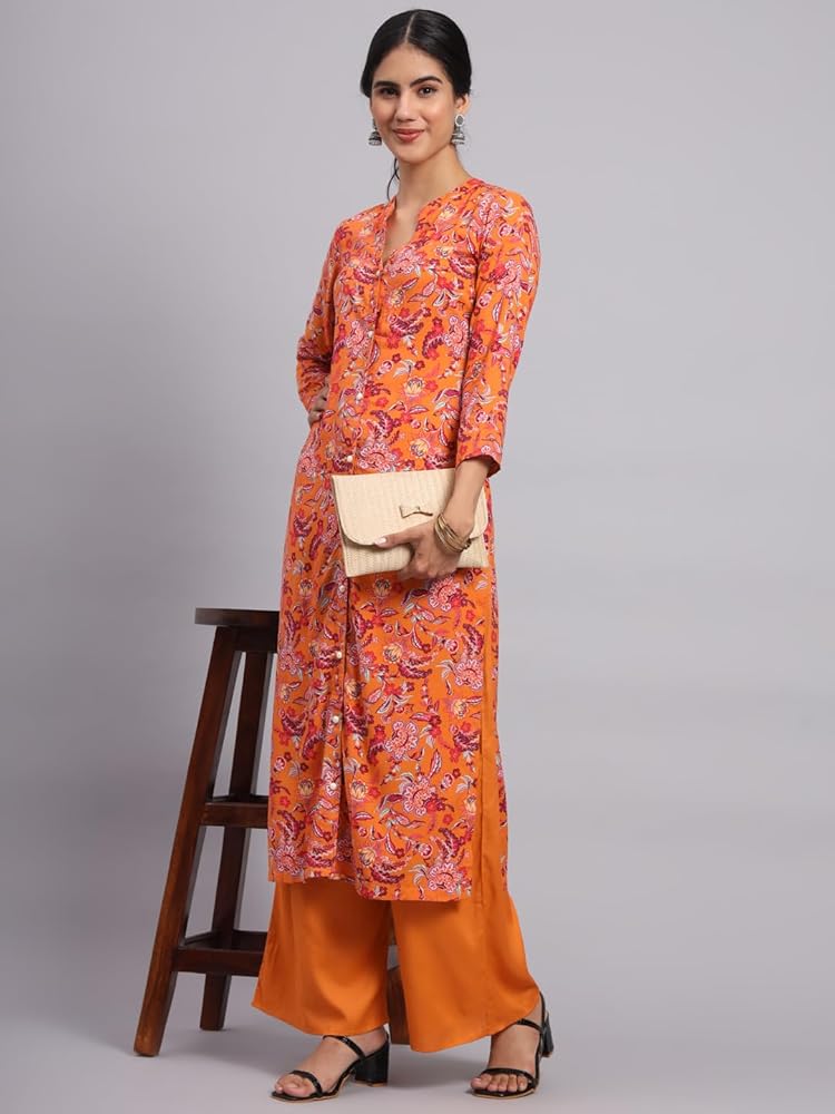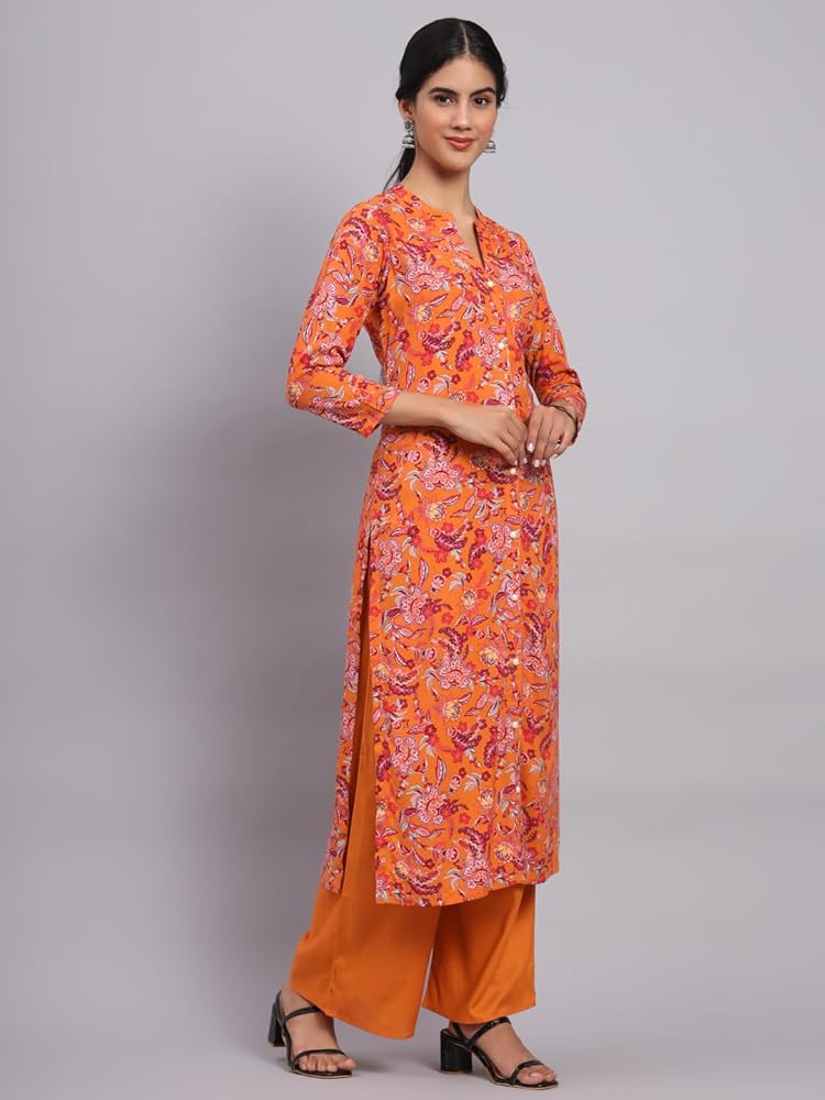 Tissu Clothing Presents Women's Orange Floral Printed Straight Kurta with Palazzos Is An Exclusive Ethnic Wear Manufactured Keeping In Mind The Taste And Preference Of Today's Women. Inseam Length Of Palazzos Is 25 Inches, And the Outseam Length is 39 Inches For All Sizes. Palazzo Has Elasticated Waistband With Drawstrings For Comfort Fit. Featuring Calf Length With 3/4 Sleeves And Mandrain Collar. This Kurta Set Is Made From 100% Rayon Fabric. It's Very Soft And Skin Friendly. You Will Always Be The Center Of Attraction Of Any Gathering By This Kurta Set. This Kurta Set Will Add Extra Class To Your Looks. This Can Be A Perfect Selection For You.