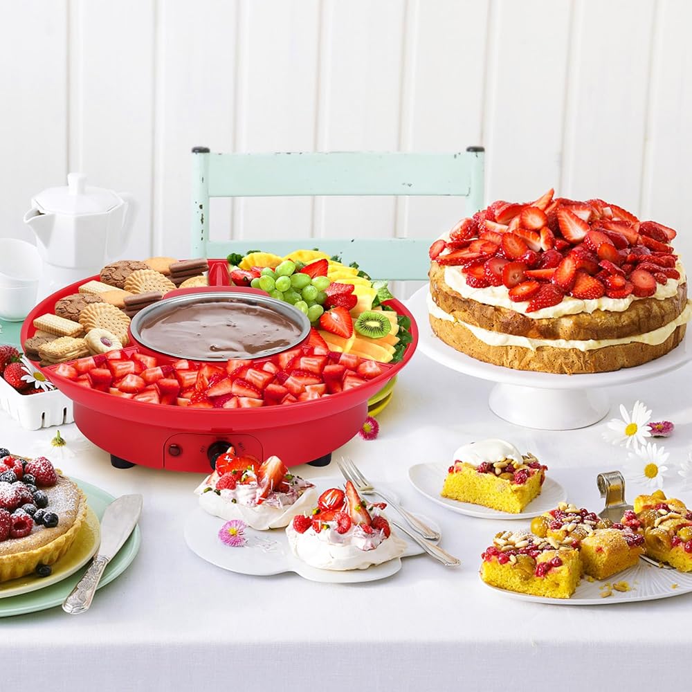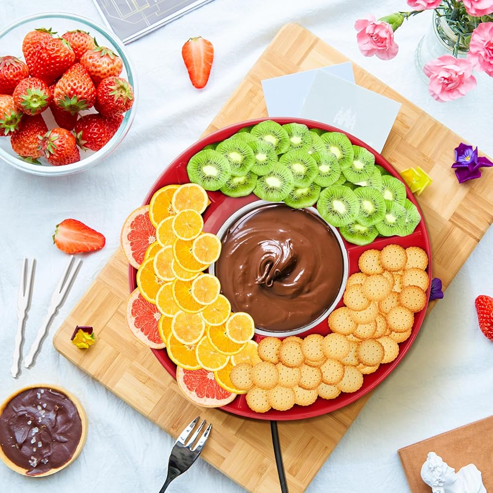 اغمسي الفاكهة والكعك والمارشميلو والمعجنات وجميع الحلويات المفضلة لديك. يمكنك بسهولة إزالة وغسل وتنظيف الأوعية والصواني الخاصة بك بعد الاستمتاع بالفوندو.