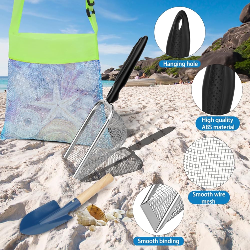Beach Toys Beach Sand Toys Set with Collapsible Beach Bucket Mesh Shovel Beach Seashell Bag and Shovel Rake Fork for Picking Up Shells Sand Sifter Fun Summer Activities