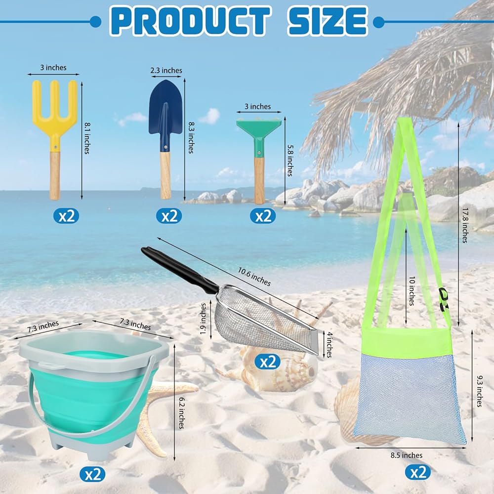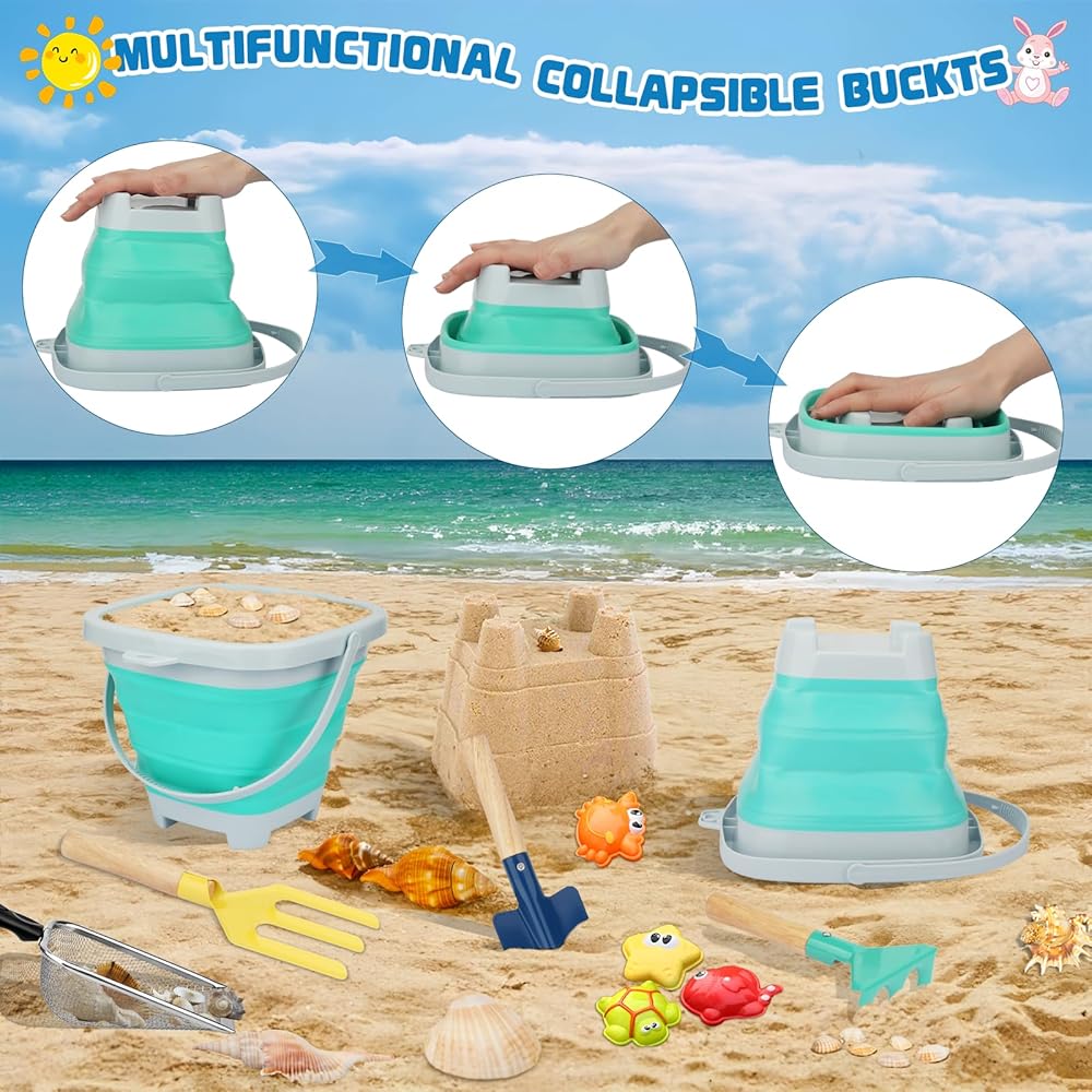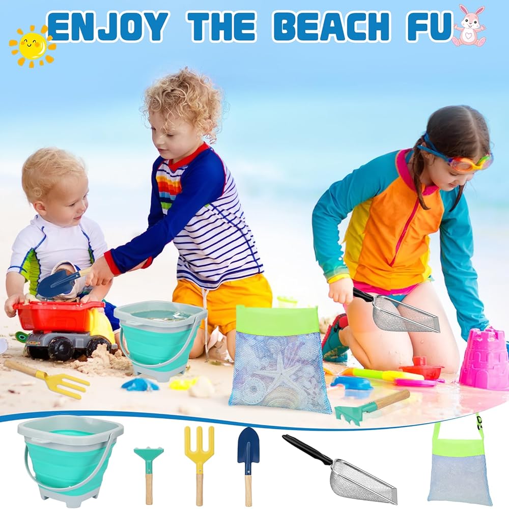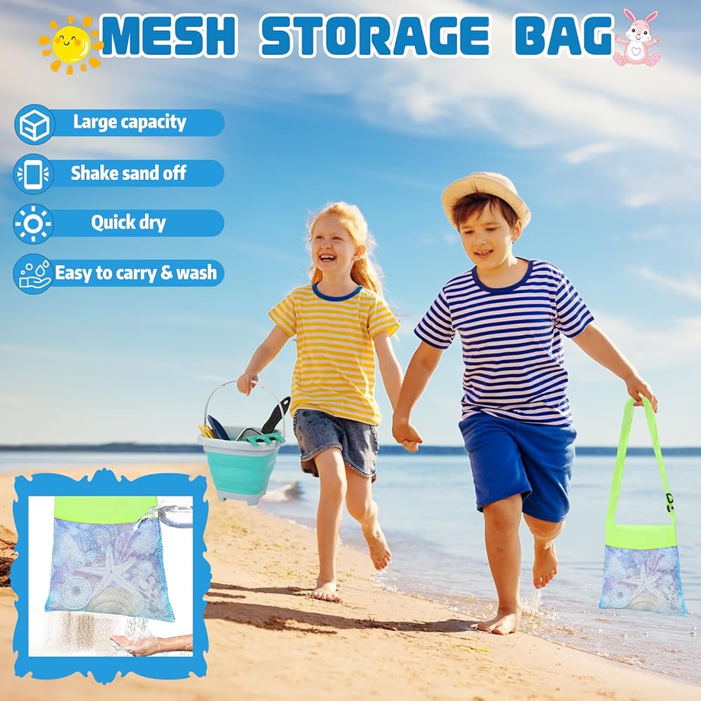 This beach sand toys for kids is easy to carry and store, does not take up too much space, and will not become a burden when playing outside; the collapsible bucket can be used for handling and storing beach toys or to hold sand and water, they can also be used as large sandbox molds and can be folded and stored when not in use; the seashell collecting bags can not only be used for shells and toys, but also as a compact bag for use and carrying