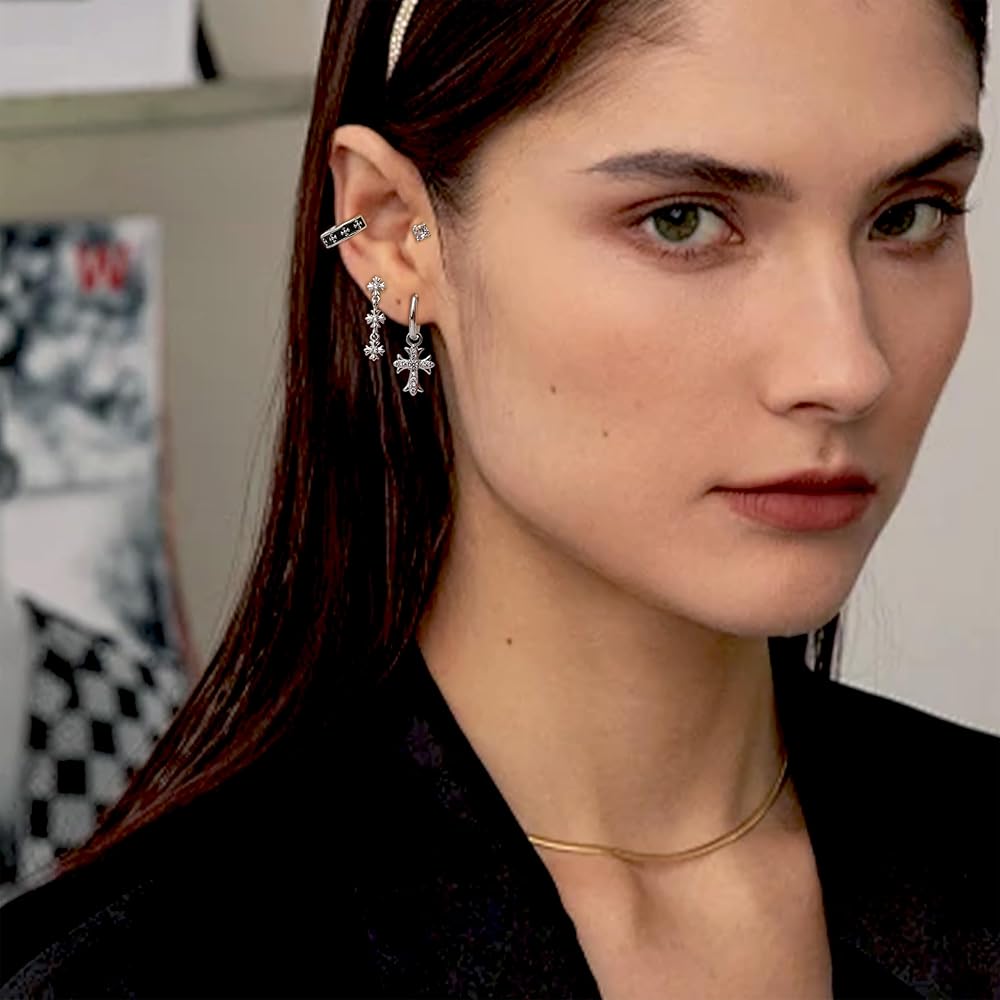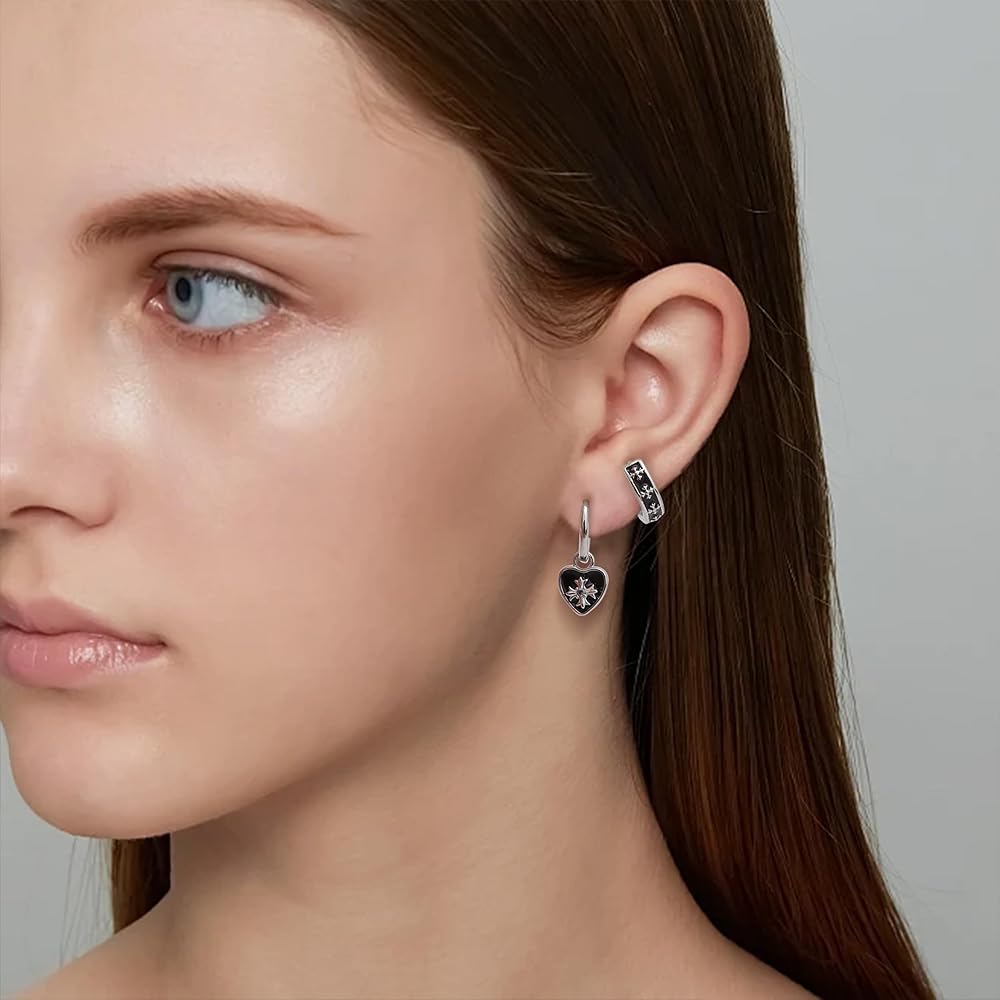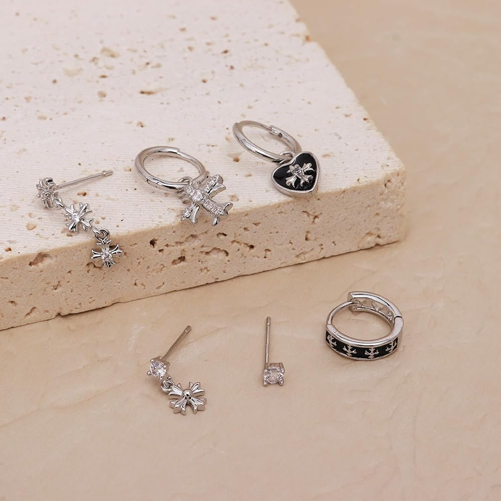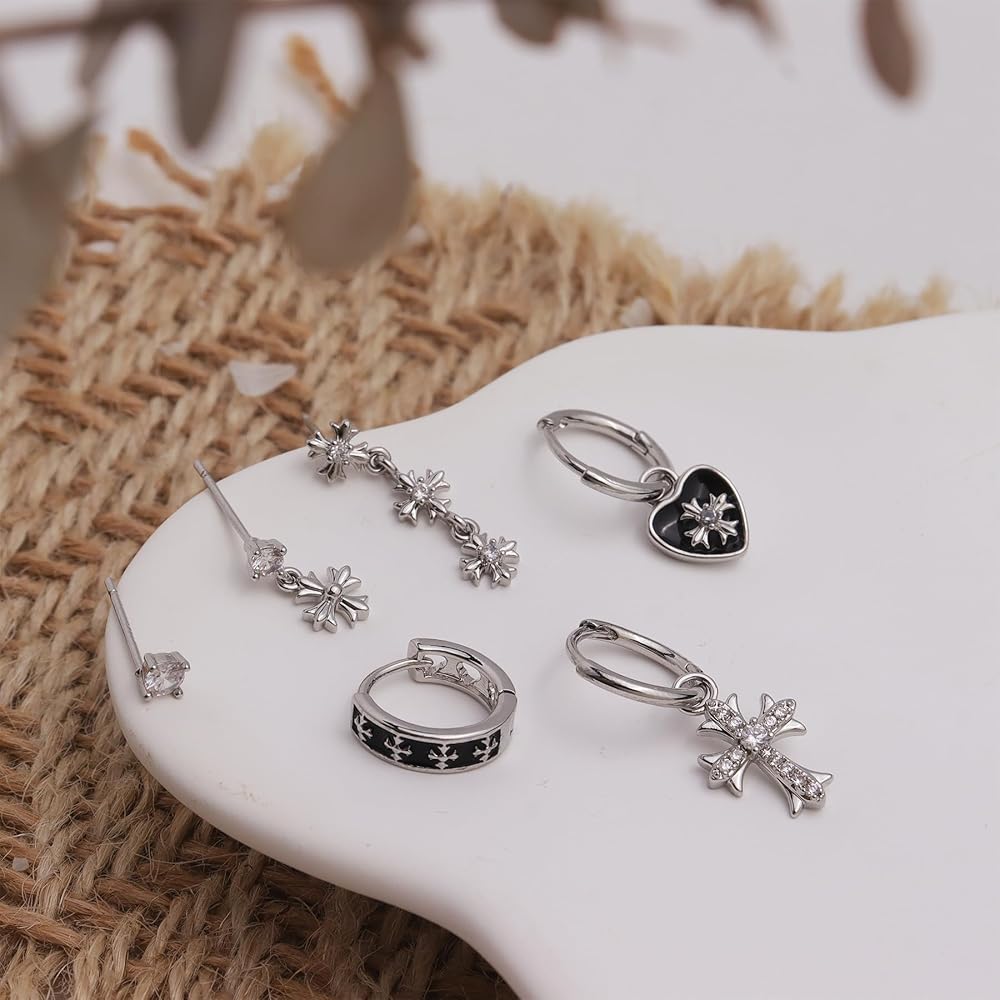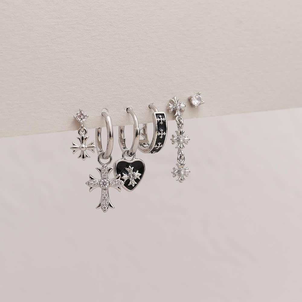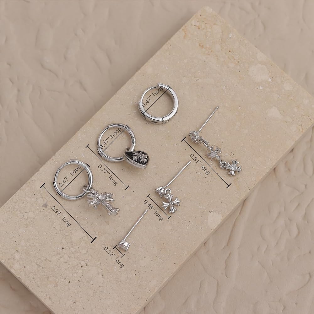 مجموعة أقراط دائرية صغيرة لطيفة وأنيقة مكونة من ستة معانقة صغيرة، مزينة بالصليب والقلب والزركونيا المكعبة اللامعة. لمسة نهائية فضية مصقولة للغاية تجسد بساطة الرقي الحديث، مثالية للفخامة اليومية البسيطة.