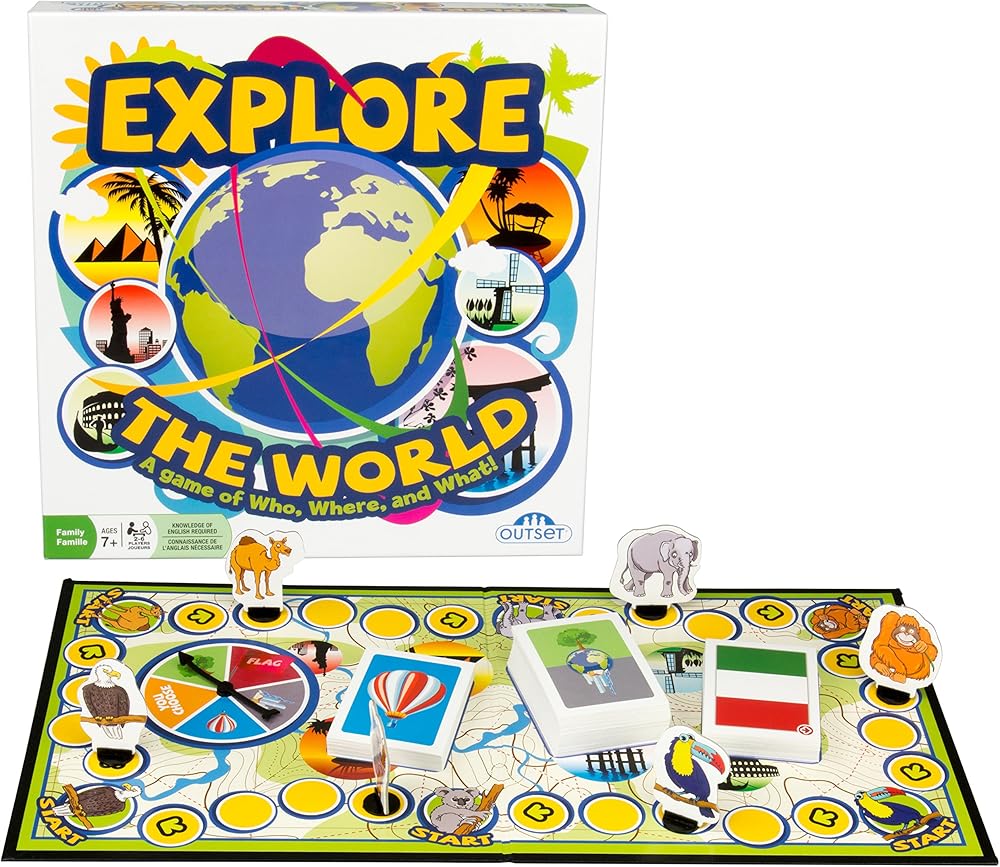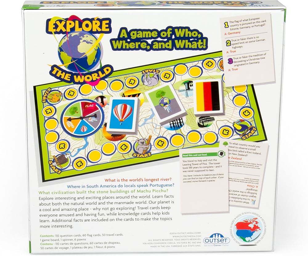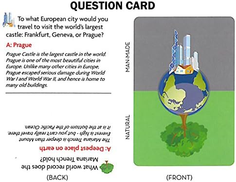 Explore interesting and exciting places around the world. Learn facts about both the natural world and the manmade world. For example, "what world record does the Mariana trench hold?" answer: deepest place on earth. This is a natural world question. If you look at the image provided for a question card sample, you'll see what a manmade world question looks like. There are also flag cards, which ask questions about the country whose flag is pictured on the card. And there are travel cards, which help players travel forward or backwards on their journey! our Planet is a cool and amazing place. Why not go exploring! explore the world is a fun and educational game for the whole family.