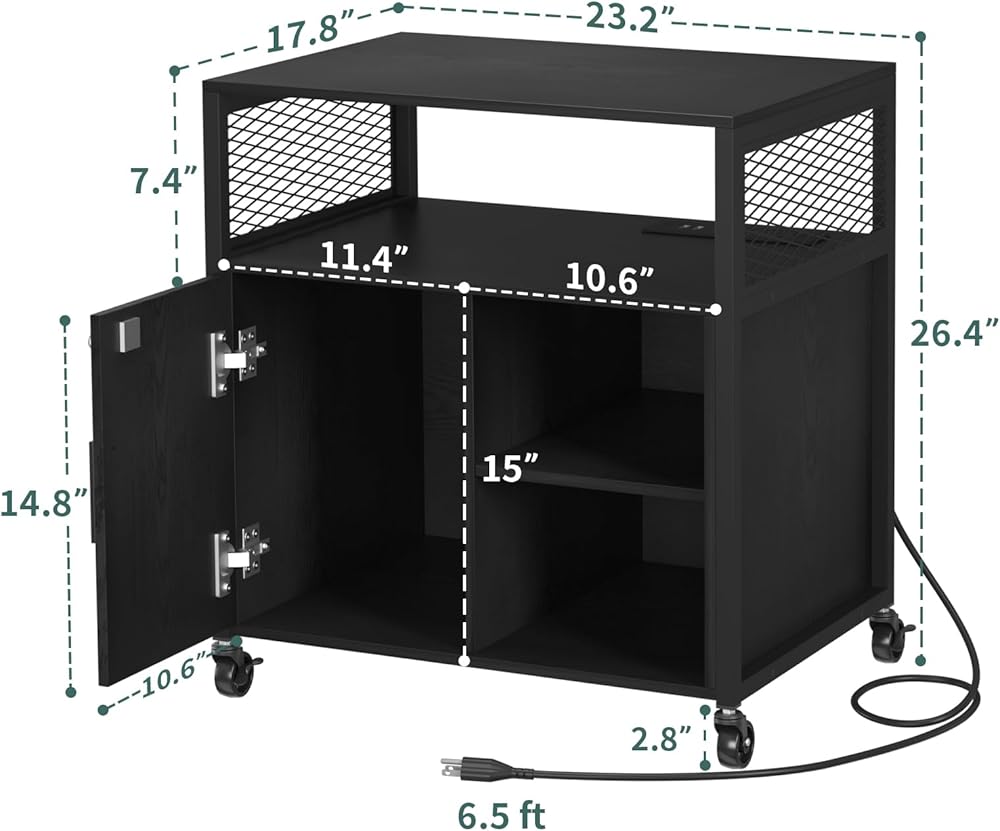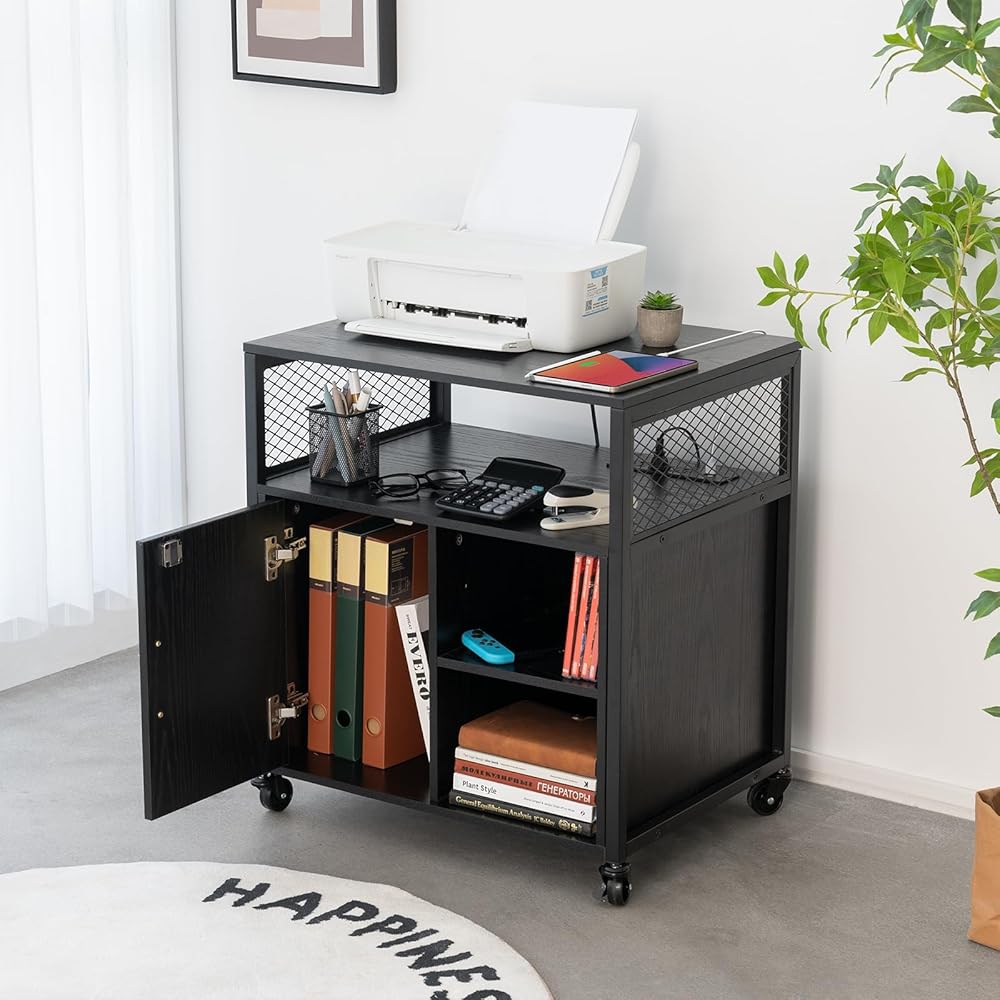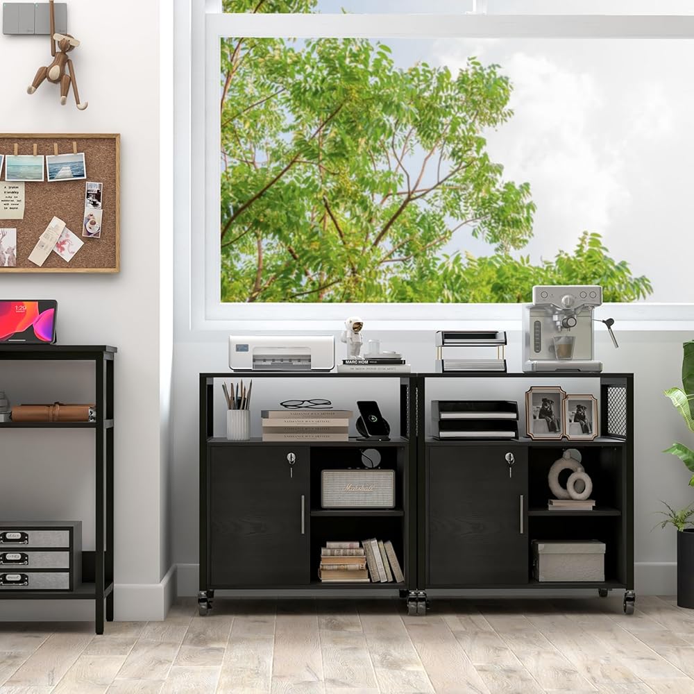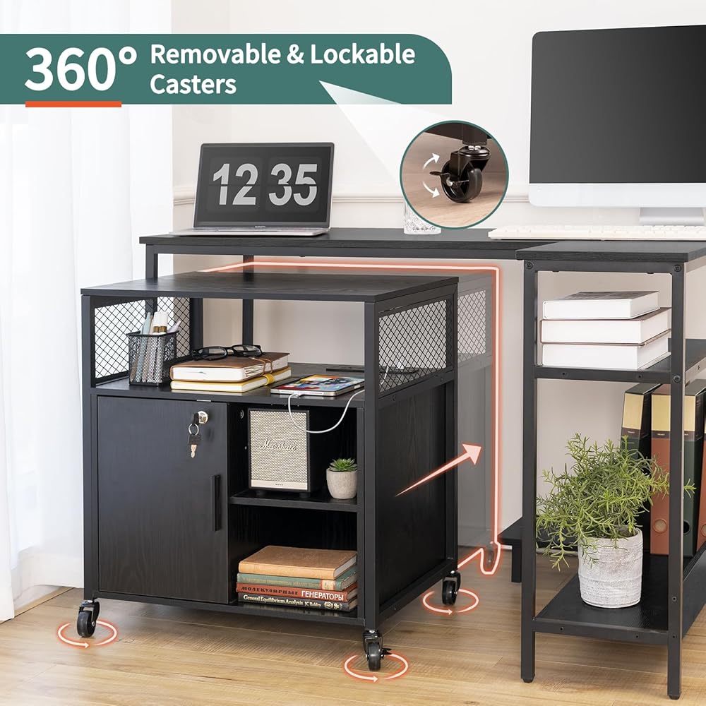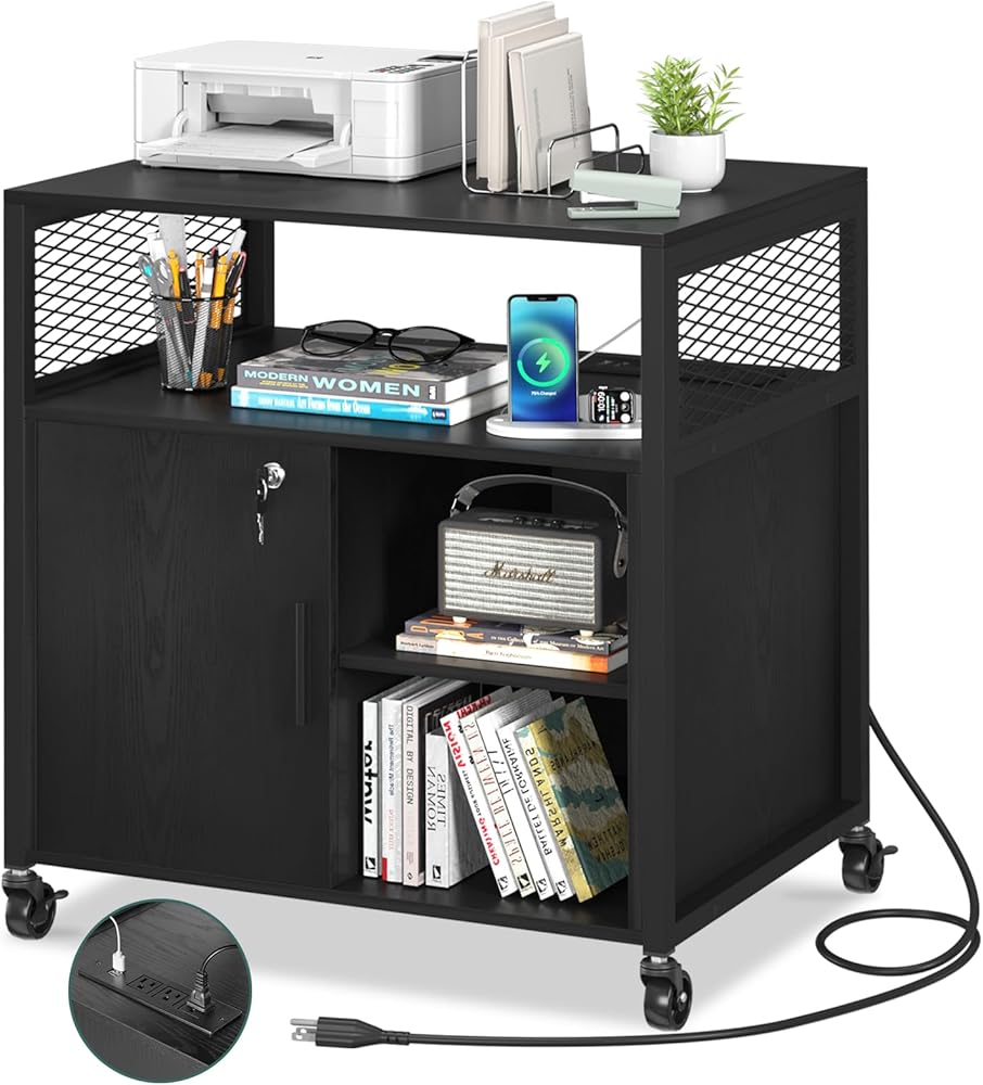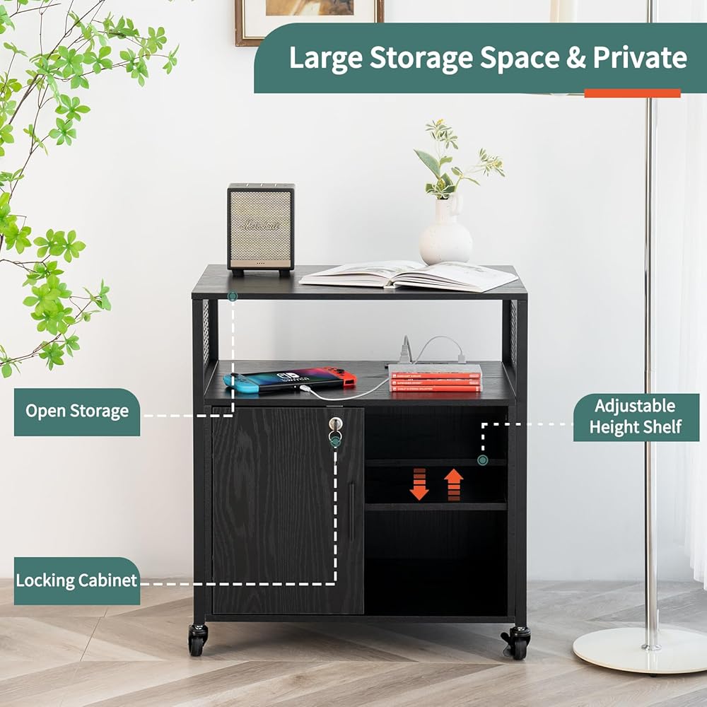 خزانة ملفات جانبية من Yoobure مع محطة شحن، خزانة ملفات بأرفف مفتوحة، حامل طابعة متدحرج مع مساحة تخزين، طاولة طابعة خزانة تخزين مكتب منزلي متنقل مع قفل، أسود