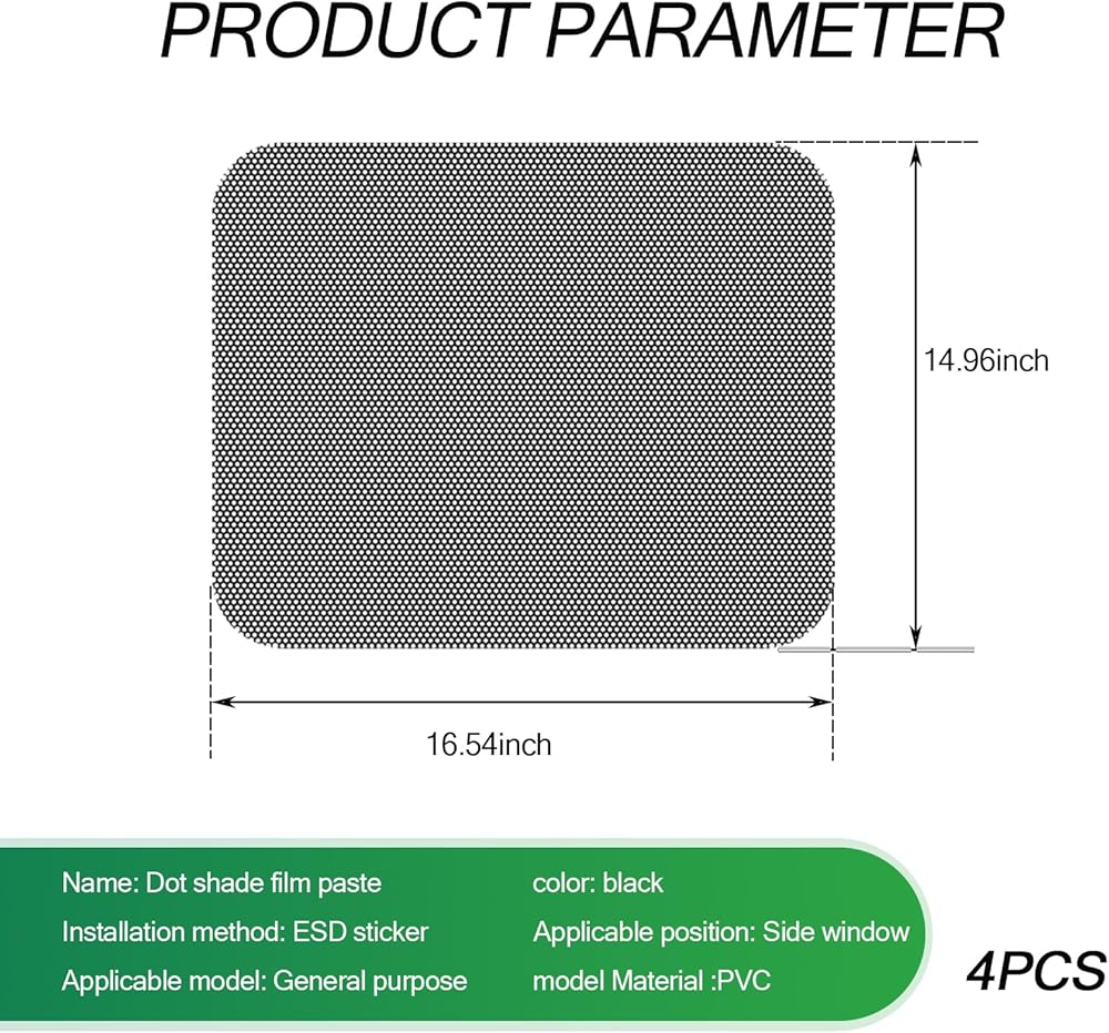 Dot Design: The size of this car side window sunshade sticker is 16.53In x 14.96In. After purchase, you will receive 4 x side window sunshade stickers, which are enough for daily use. This car side window sunshade sticker can provide privacy inside the car.