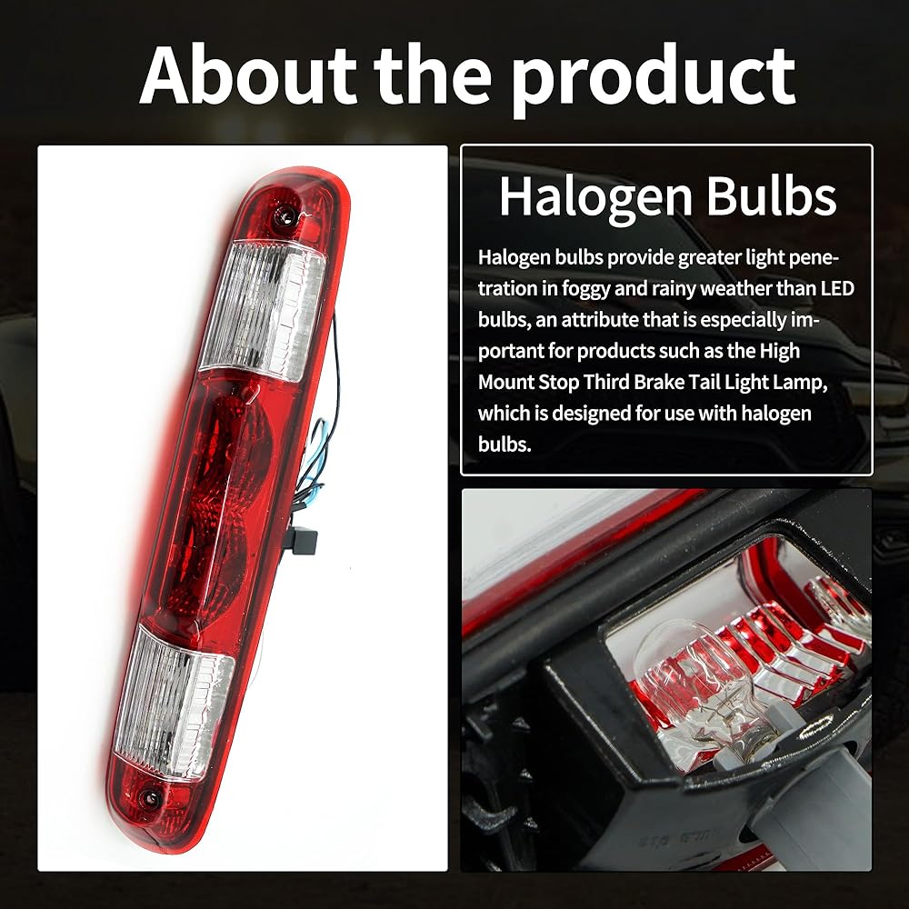 • مصابيح الهالوجين: توفر مصابيح الهالوجين اختراقًا أكبر للضوء في الطقس الضبابي والممطر مقارنة بمصابيح LED، وهي سمة مهمة بشكل خاص لمنتجات مثل مصباح الإضاءة الخلفية للفرامل الثالثة عالي التثبيت، المصمم للاستخدام مع مصابيح الهالوجين.