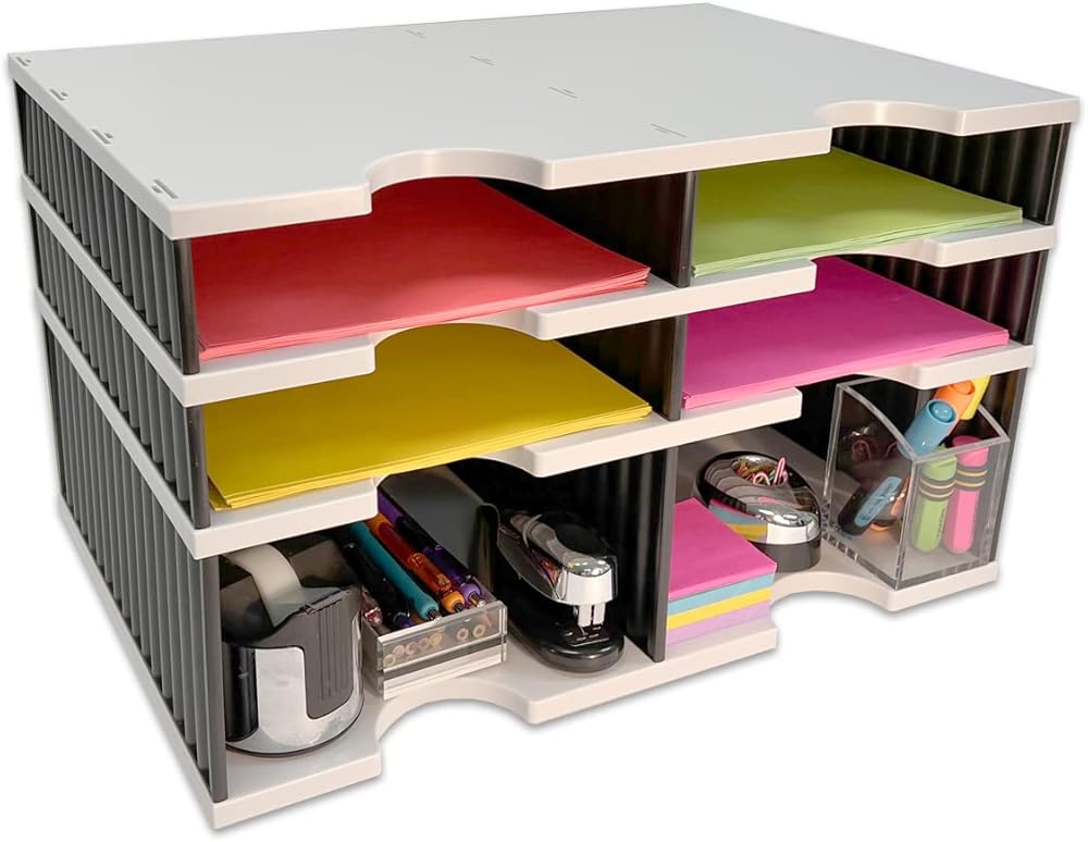 الكثير من الوظائف في تصميم مضغوط - يبلغ قياس الوحدة الإجمالي 19 1/8 بوصة عرضًا × 17 بوصة ارتفاعًا × 13 بوصة عمقًا. يجمع بين 8 مساحات لصينية الحروف، ومقصورتين لقاعدة تخزين الناهض في منظم واحد مدمج. مقصورات صينية الرسائل قياس كل منها 9 1/16 عرض × 2 1/4 بوصة ارتفاع × 12 3/4 بوصة عمق. حجرات قاعدة تخزين الناهض يبلغ قياس كل منها 9 1/16 بوصة عرض × 5 بوصة ارتفاع × 12 3/4 بوصة عمق.