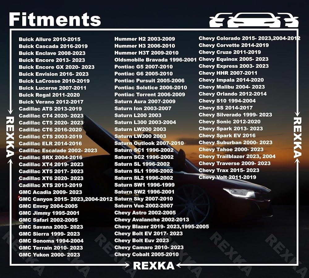 - Fits Buick:Encore GX, Envision, Enclave, Encore, Regal TourX, Cascada, LaCrosse, Verano, Regal; Cadillac:CT4, CT5, XT6, Escalade, Escalade ESV, ATS, CTS, XTS, ELR, SRX, Escalade EXT; GMC:Hummer EV Pickup, Sierra 1500, Sierra 2500 HD, Sierra 3500 HD, Terrain, Yukon, Yukon XL, Canyon, Acadia, Acadia Limited, Yukon XL 1500, Yukon XL 2500, Sonoma, Jimmy; Hummer: H3, Oldsmobile:Bravada, Pontiac: G8, Torrent; Saturn: Outlook, Ion, Vue, SL, SL1, SL2, SW2, SW1