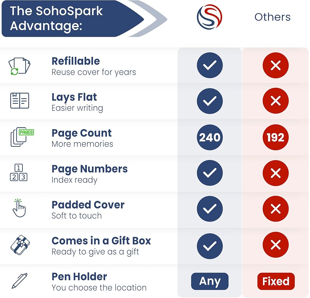 إعادة الملء بسهولة – استخدم نفس غطاء مجلة الكتابة الأنيق لسنوات. أعد ملئها بدفتر SohoSpark الأصلي المسطح. اطلع على كتالوج SohoSpark الكامل لجميع تصميمات الغلاف.