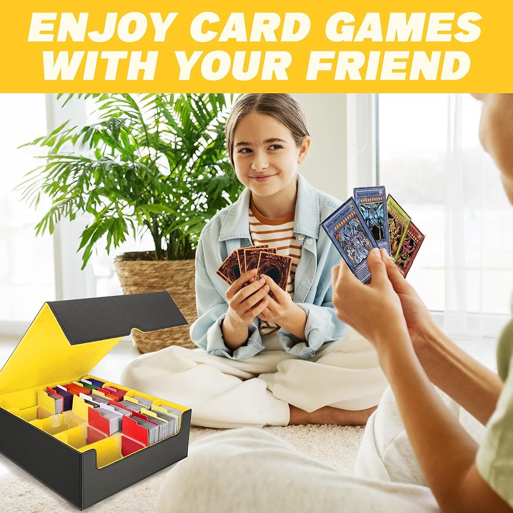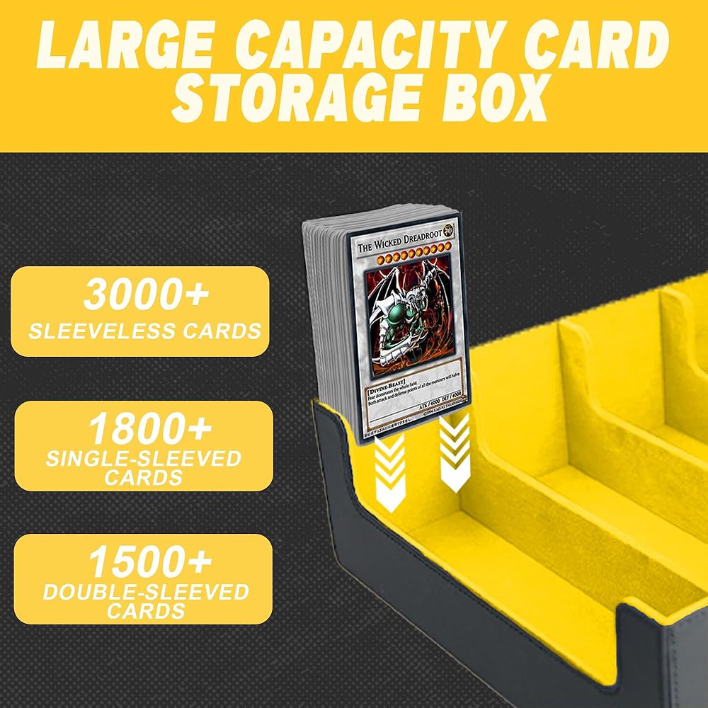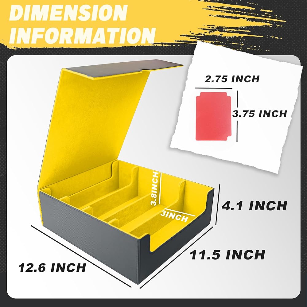 3000+ Large capacity: Our product is upgraded compared to the common 2-row or 3-row card boxes on the market. The large capacity of the 4-row card box allows you to hold more cards. Its size is 11.5 x 12.6 x 4.1 inches, which can easily accommodate 3000+ sleeveless cards, 1800+ single-sleeved cards, and 1500+ double-sleeved cards. But it is not suitable for top-loading card sleeves and magnetic holders.(Tips: Our card storage boxes fit standard trading card sizes, up to 3 x 3.8 inches. Please check the dimensions before purchasing)