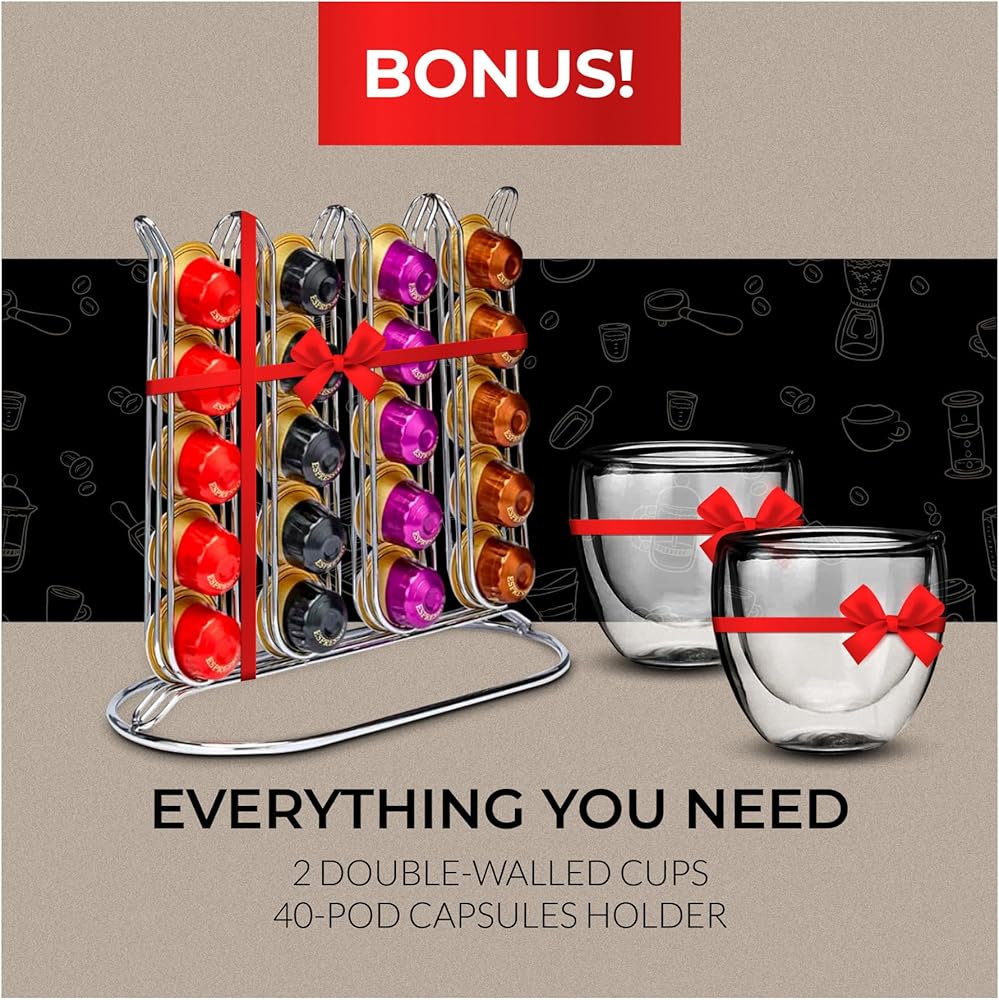 Everything You Need: Everything you need to start enjoying a smooth espresso is included with the best coffee machine. It includes a capsule holder for 40 pods and a pair of double wall glass espresso cups. Each single cup has a capacity of 2.7 ounces