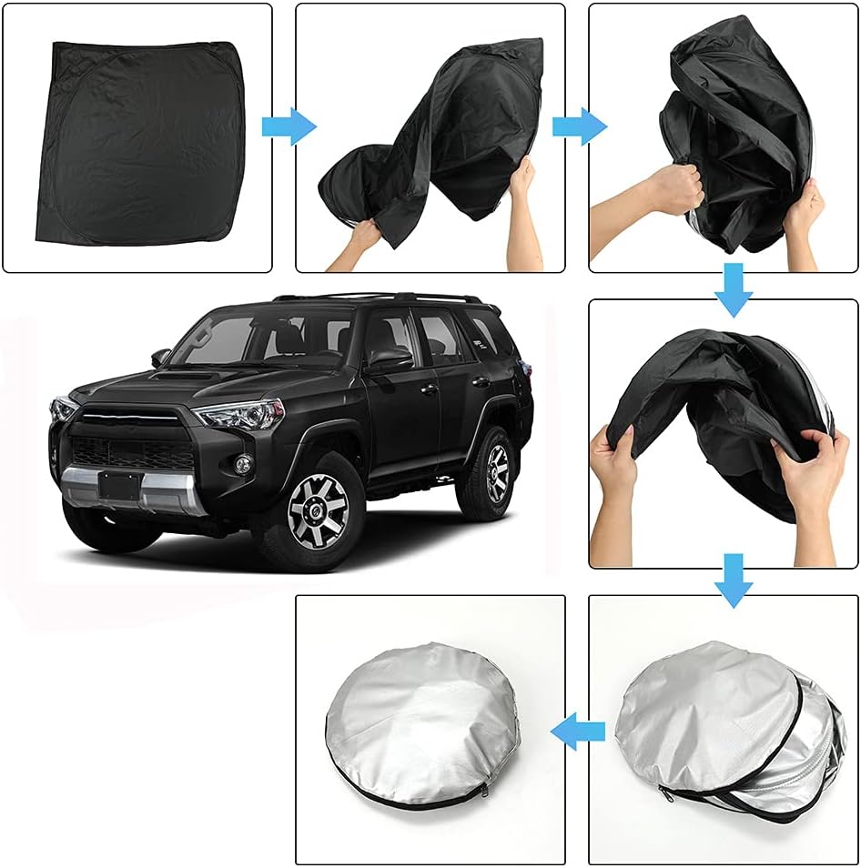 يعمل مكيف الهواء بشكل أسرع وأسهل: باستخدام طاقة وغاز أقل بدلاً من الاضطرار إلى الانتظار لمدة 15 دقيقة حتى يبرد مكيف الهواء سيارتك، يبرد مكيف الهواء بشكل أسرع وأسهل. يوفر أموالك بينما يجعل قيادتك أكثر راحة ومتعة. سهل التركيب والتخزين: مع ملاءمة دقيقة، تحتاج فقط إلى المحاذاة والتركيب والثبات والإزاحة. 4-مظلة للزجاج الأمامي سهلة التخزين بسبب المرونة القوية وقابلية الطي