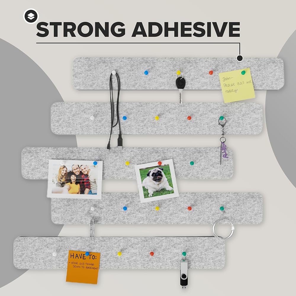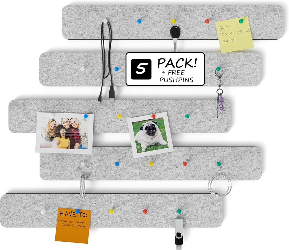 محتويات العبوة - تحتوي على 5 شرائط لوحة إعلانات للحائط متضمنة دبابيس دفع مجانية يمكن استخدامها للوحة مكتبك. إنها سميكة بما فيه الكفاية بحيث لا تتغلغل الدبابيس بشكل أعمق من لوحة الفلين للجدار، مما يترك جدارك ناعمًا ونظيفًا دون التسبب في أي ضرر