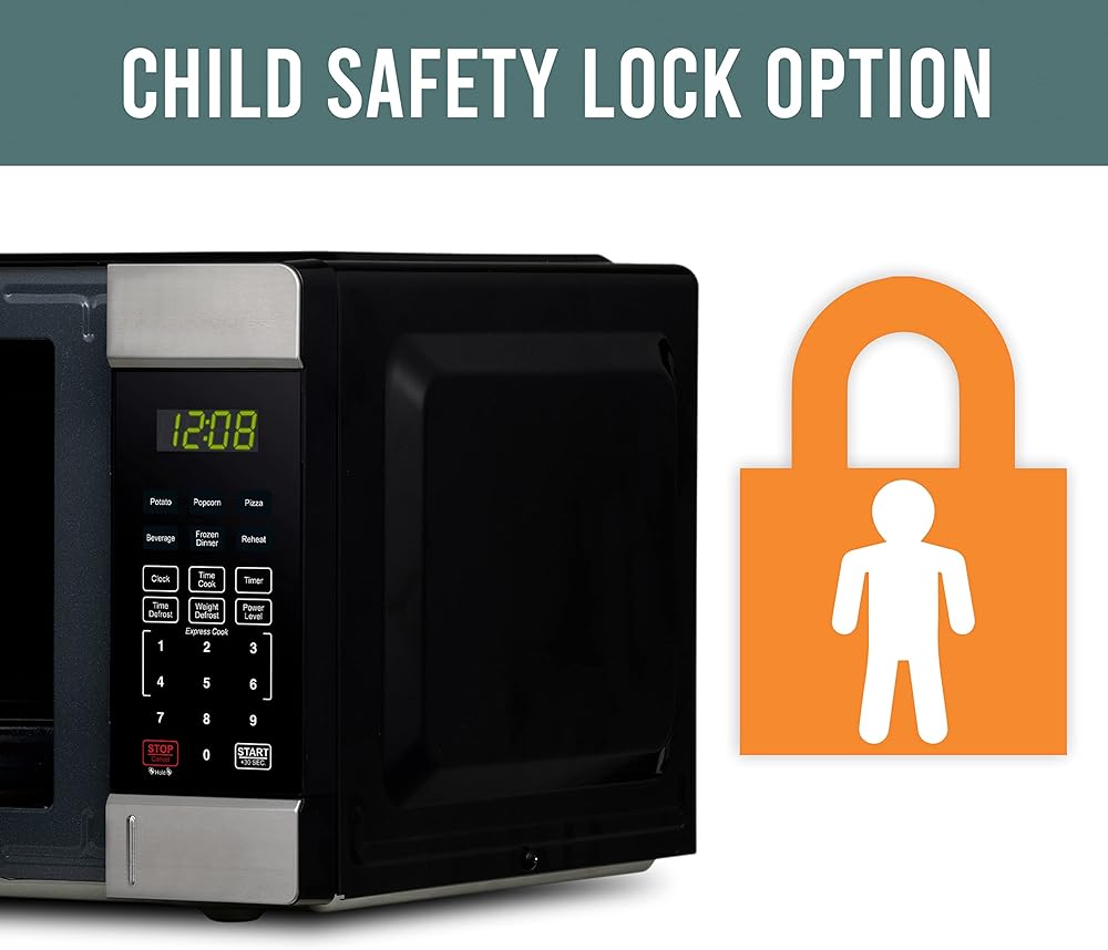 • ALL YOU NEED: This microwave has a clear LED display with a kitchen timer and clock that lets you easily keep track of time. Easy-to-view interior lighting lets you keep an eye on your dish, and a child safety lock adds additional security.