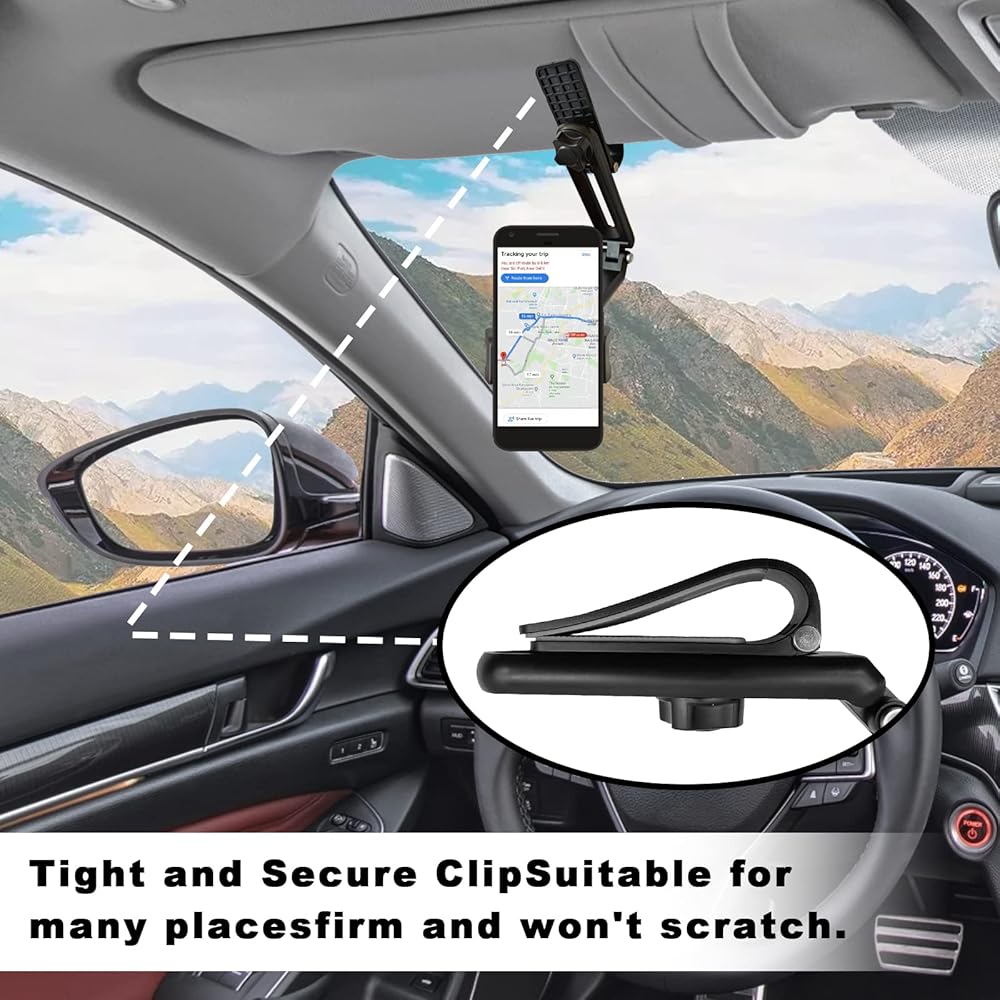 【High quality and Super Stable】This sun visor phone holder for car mount is designed with an arc-shaped clip, with a soft non-slip silicone pad inside, plus a spring design that can be tightly clamped anywhere, even on bumpy roads or braking driving, they also can be firm enough to hold at the air vent, keeping the phone stable even in extremely harsh environments.
