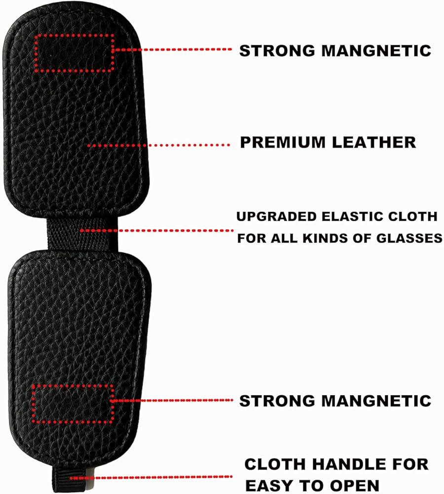 【ملاءمة آمنة لمعظم النظارات الشمسية】- حامل النظارات الشمسية للسيارة مع إغلاق مغناطيسي، ومغناطيسية قوية وجلد ناعم يمكن قص نظارتك الشمسية بشكل آمن، فهو يناسب مقاسات النظارات الشمسية تقريبًا في السوق، مما يجعله إكسسوارًا متعدد الاستخدامات لجميع احتياجات نظاراتك أثناء القيادة.