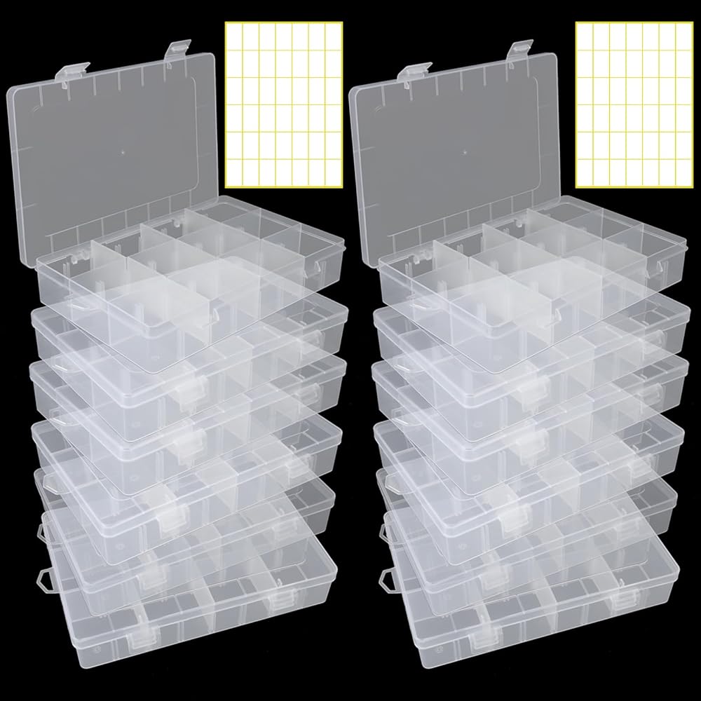 APACALI 12 حزمة من 12 شبكة صندوق تنظيم بلاستيكي مع فواصل، 18 حجرة (+ ملصقات)، منظمات صندوق معالجة وتخزين الحرف اليدوية، منظم أجزاء صغيرة شفافة، صندوق منظم لصيد الأسماك للخرز الفني الذي تصنعه بنفسك