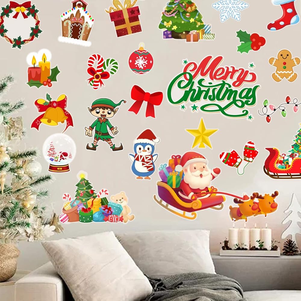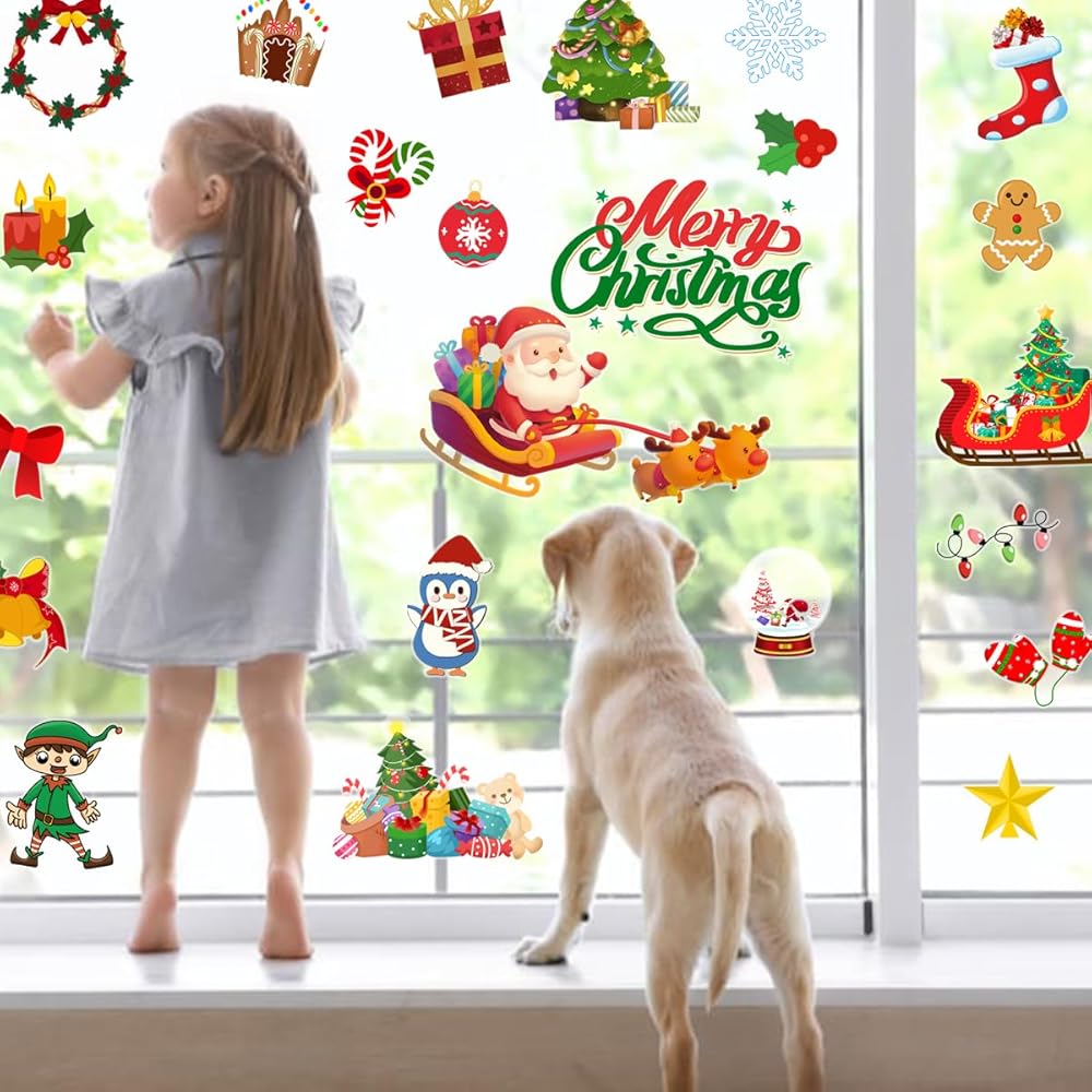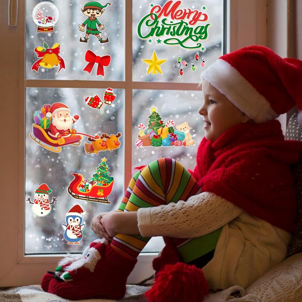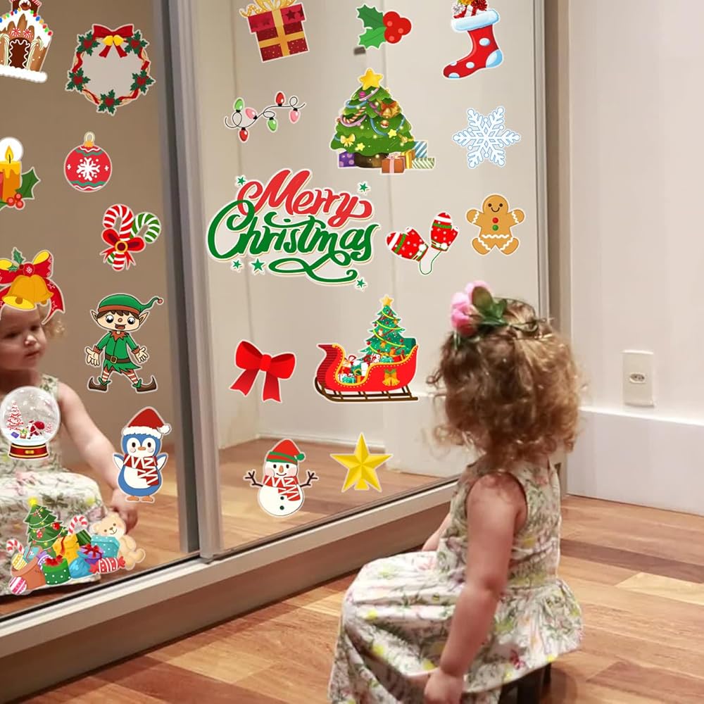 Package includes: There are 24 kinds of Classic Christmas elements thick gel clings with different Christmas elements patterns and Alphabet, your child's imagination can be enhanced by these cute and pretty Christmas window stickers.