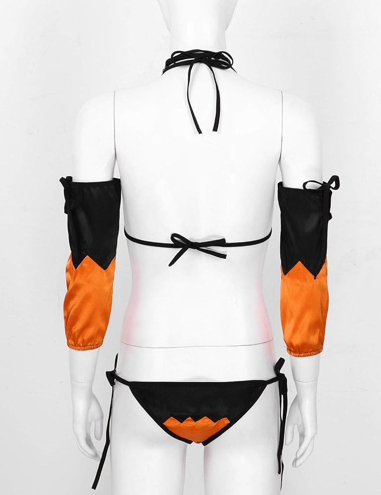 - Classic black and orange color match, full of festive atmosphere, halter neck and tie-on bra and G-string briefs, fit all figure