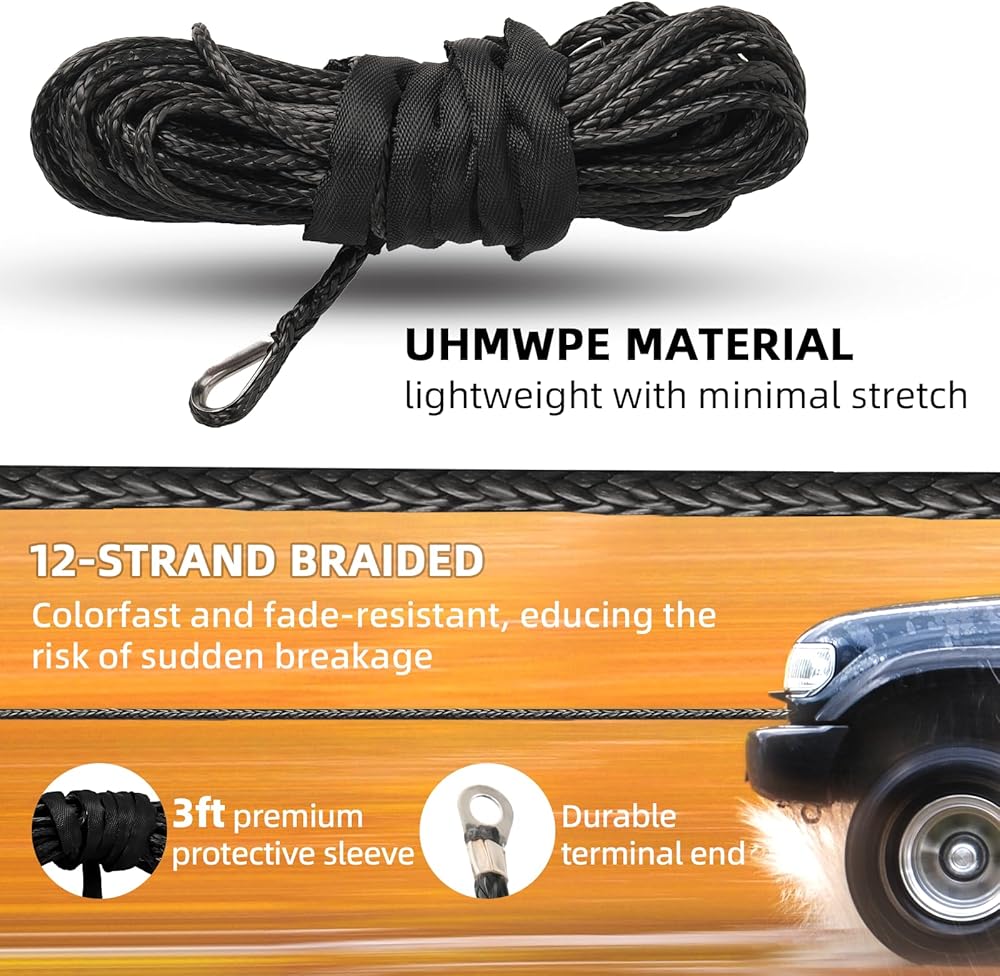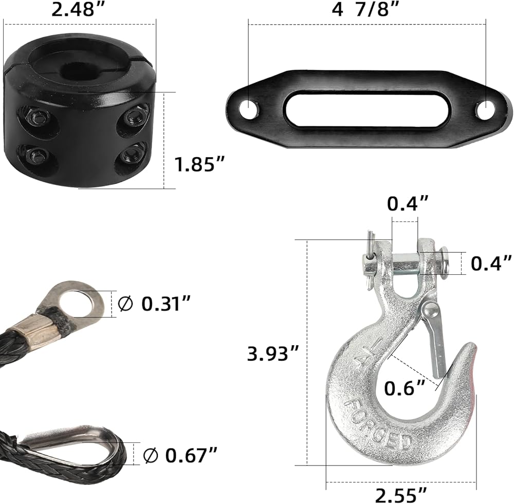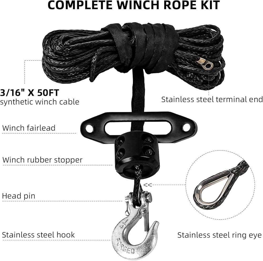 ملحقات السحب الكاملة: تشتمل مجموعة كابل الونش هذه على حبل ونش صناعي بطول 3/16 بوصة × 50 قدم مع كم (يتميز بحلقة من الفولاذ المقاوم للصدأ ودبوس رأس)، وسلسلة رافعة، وخطاف ونش فولاذي عالي التحمل، وسدادة مطاطية وحزام سحب آمن. تعد مجموعة إصلاح البولي إيثيلين هذه بديلاً مثاليًا لمجموعة أدوات الاسترداد على الطرق الوعرة لمعظم الروافع على ATV وUTV وSUV والطرق الوعرة 4x4