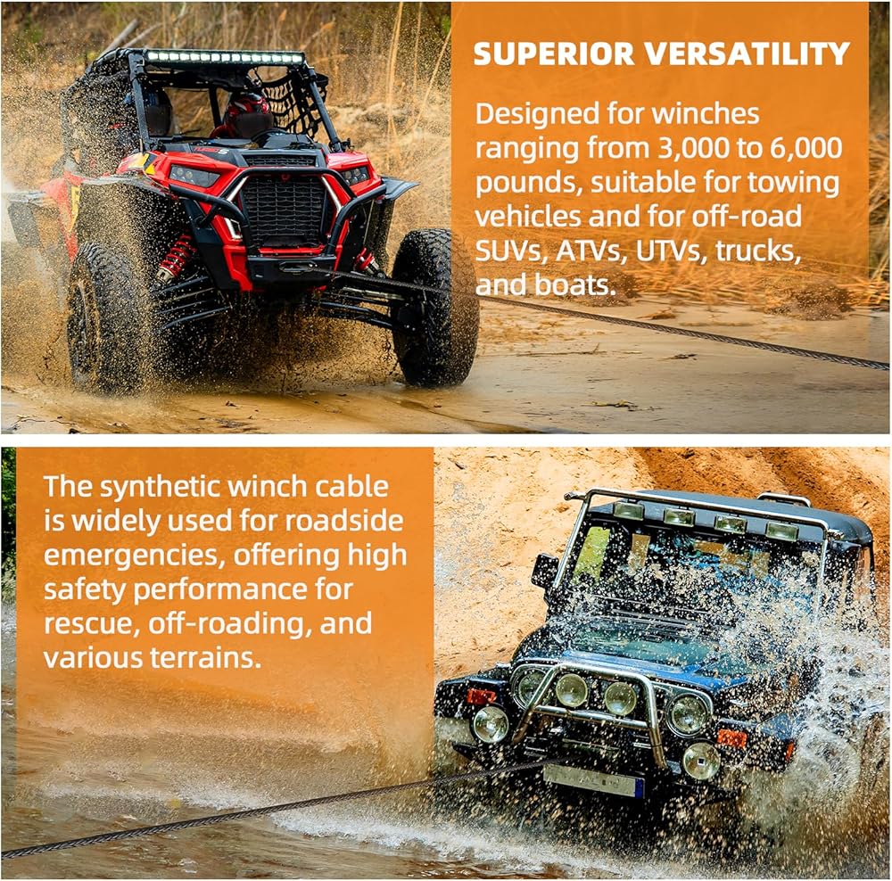 تنوع فائق: تم تصميم كابل الونش الاصطناعي للروافع التي يتراوح وزنها من 3000 إلى 6000 رطل. يستخدم حبل تمديد الونش على نطاق واسع في حالات الطوارئ على جانب الطريق، مما يوفر أداء أمان عالي للإنقاذ والقطر والانتعاش والإصلاح والتضاريس المختلفة.