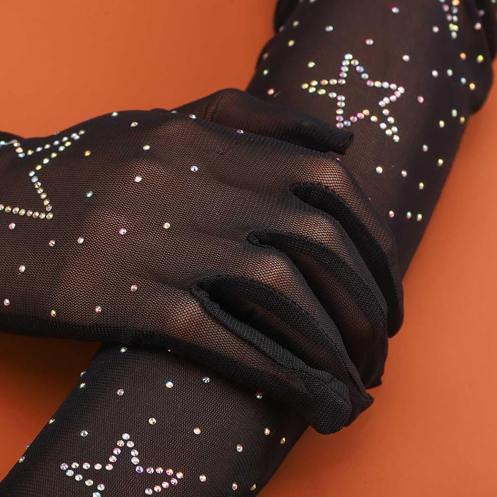 - القفازات الشبكية السوداء مع أحجار الراين التي تبدو وكأنها منقطة بالنجوم تجعل القفازات تبدو أكثر جمالاً وأناقة.