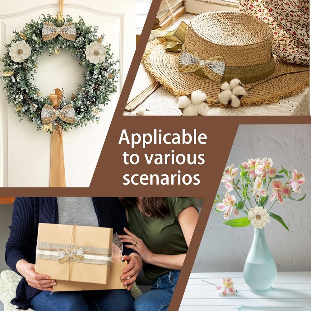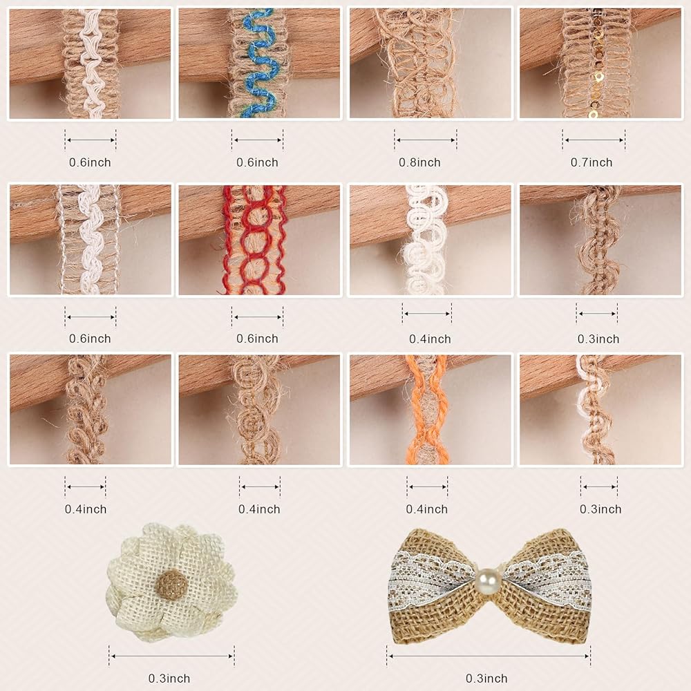 【PACKAGE INCLUDED】You will receive 12 rolls of different style jute ribbons that each roll is 2 meters long, 2pcs burlap flowers and 2pcs burlap bows