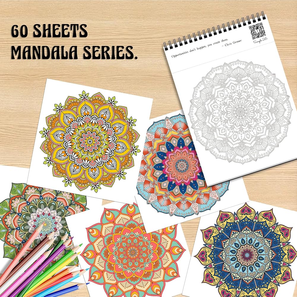 كتاب التلوين لتخفيف التوتر: يحتوي كتاب التلوين الخاص بنا على 60 تصميمًا معقدًا للماندالا، مرتبة من السهل إلى الصعبة، ومنسقة علميًا لمساعدتك على إبطاء وتخفيف التوتر والانغماس في فن الإبداع.