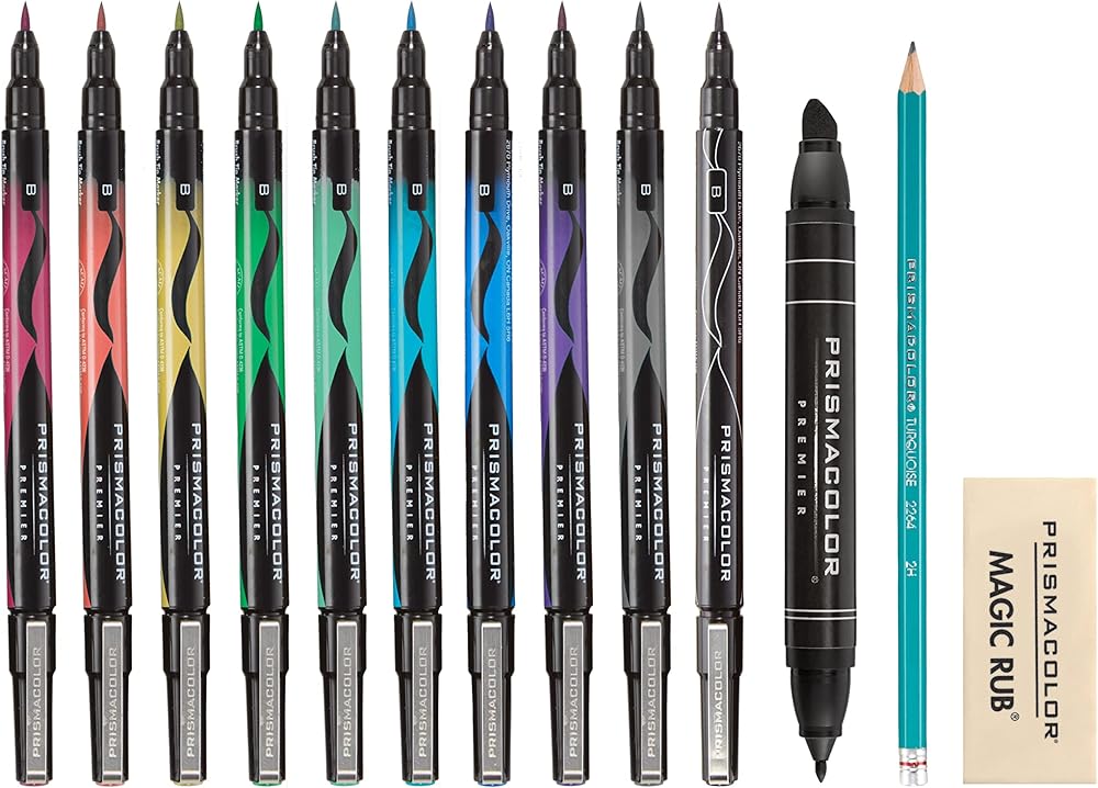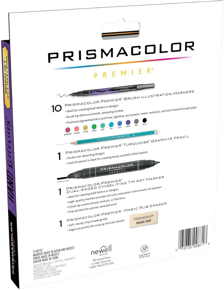 Ideal for perfecting your craft, Prismacolor Beginner and Advanced Hand Lettering Sets include a variety of graphite pencils, Prismacolor Premier Double-Ended Art Markers, and Prismacolor Premier Illustration Markers for creating hand-lettered cards, artwork, albums, and more. - Prismacolor Hand Lettering Set - Brush, 13-Piece SetPrismacolor Hand Lettering Set, BRUSH 13 CT SET - This set includes 10 Brush Tip Illustration Markers in Raspberry, Salmon, Yellow, Mint, Green, Teal, Blue, Purple, Gray, Black, a 2H graphite pencil, a Premier Double-Ended Art Marker in Black, a kneaded eraser, and a "How to Hand Letter" booklet with tips.