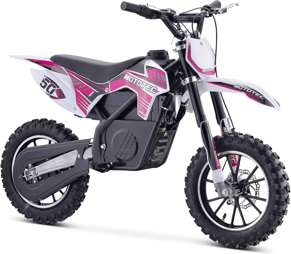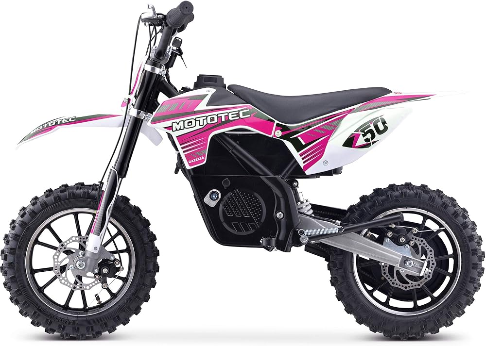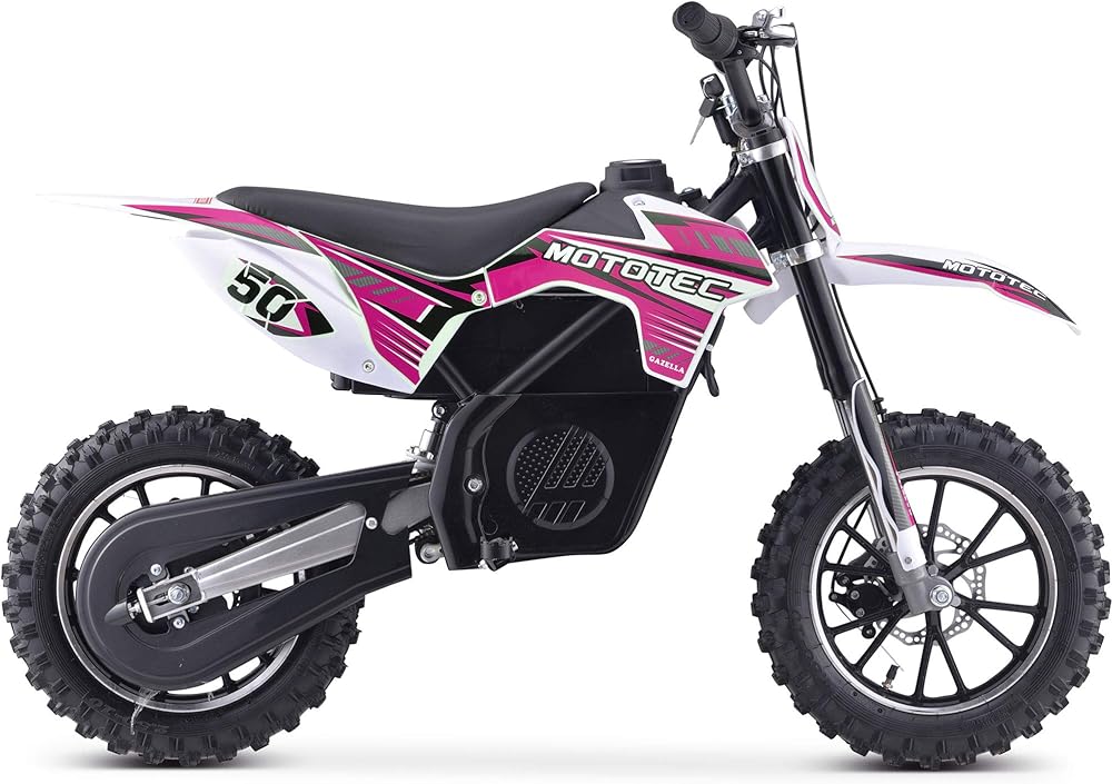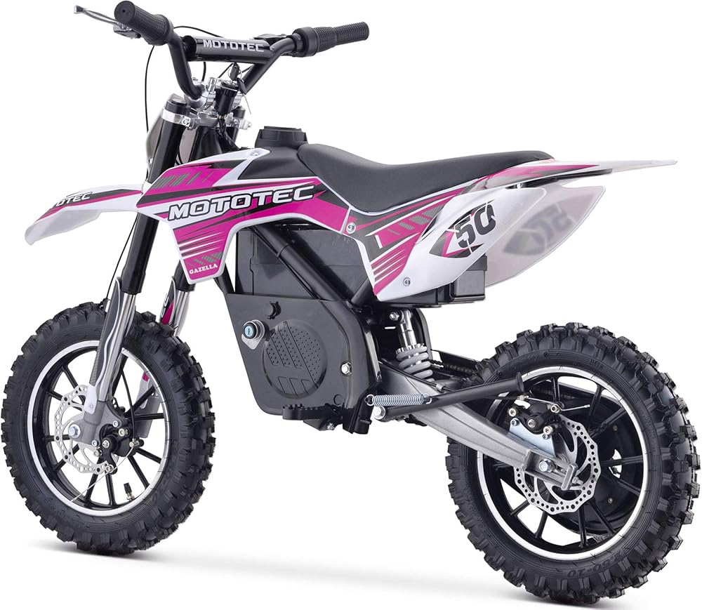 The MotoTec 24v 500w Gazella Electric Dirt Bike is the ultimate kids ride! Great for driveway and backyard fun, cruise over bumps and speed through dirt trails with ease. Comes standard with front & rear suspension, front & rear brakes, parent selectable speeds and large knobby tires. The battery can be removed and charged separate from the bike for nonstop fun. SAFETY FIRST - ALWAYS WEAR YOUR HELMET AND ALL SAFETY EQUIPMENT AND OBSERVE SAFE RIDING RULES!!! A parent's decision to allow his or her child to ride this product should be based on the child's maturity, skill and ability to follow rules. Motor: 24 Volt 500 Watt (Rare Earth - Neodymium Magnet) Battery: TWO 12v 12ah (24v total) Speeds: 5, 10, 16 MPH (3 speeds, selectable with key lock) Distance Per Charge: 4 - 9 miles (weight, terrain dependent) Recommended Age: 13+ Max Rider Weight: 150 lbs Chain Drive: Yes (11T front, 80T rear) Frame: Steel Tires: 2.5x10 Knobby Pneumatic Rims: Aluminum Brakes: Front and rear disc Suspension: 2 Front shocks, 1 Rear shock Throttle: Variable twist-grip Seat: Padded (single rider) Handlebars: Adjustable Forward/Back Battery Meter: Yes Key Start: Yes Charging Time: 4-6 hours Charger Included: Yes Assembly Required: Yes Wheelbase: 34 inches Seat Height: 23 inches Min Ground Clearance: 9 inches Product Size: 49x22x32 inches Product Weight: 66 lbs Box Size: 42x13x22 inches Box Weight: 77 lbs Product decoration and specifications subject to change without notice. Warranty: 30 days parts replacement