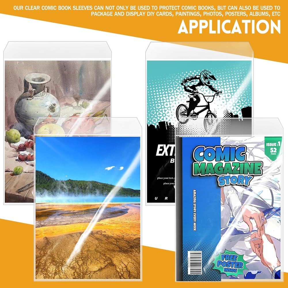 • التطبيق: لا يمكن استخدام أغلفة الكتب المصورة الشفافة لحماية الكتب المصورة فحسب، بل يمكن استخدامها أيضًا لتعبئة وعرض بطاقات DIY واللوحات والصور والملصقات والألبومات وما إلى ذلك. مثالية للشركات الصغيرة والمحلات التجارية والمنازل والمكاتب، المكتبات، عشاق جمع