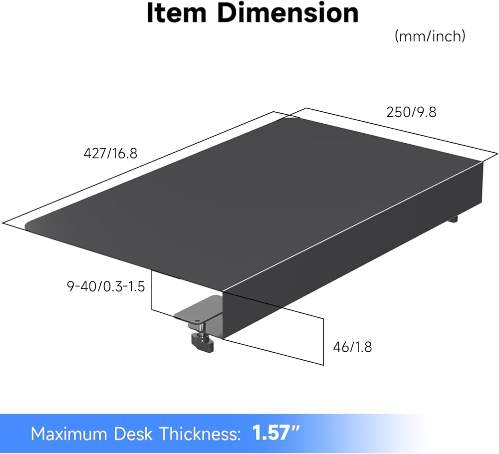 توافق متعدد الاستخدامات - يتميز بمنصة مقاس 16.8 بوصة × 9.8 بوصة، ويتم تثبيت هذا الامتداد بشكل آمن على المكاتب التي يصل سمكها إلى 1.57 بوصة. يتضمن ثلاثة أحجام للمشابك لضمان ملاءمة محكمة على أسطح سطح المكتب المختلفة.