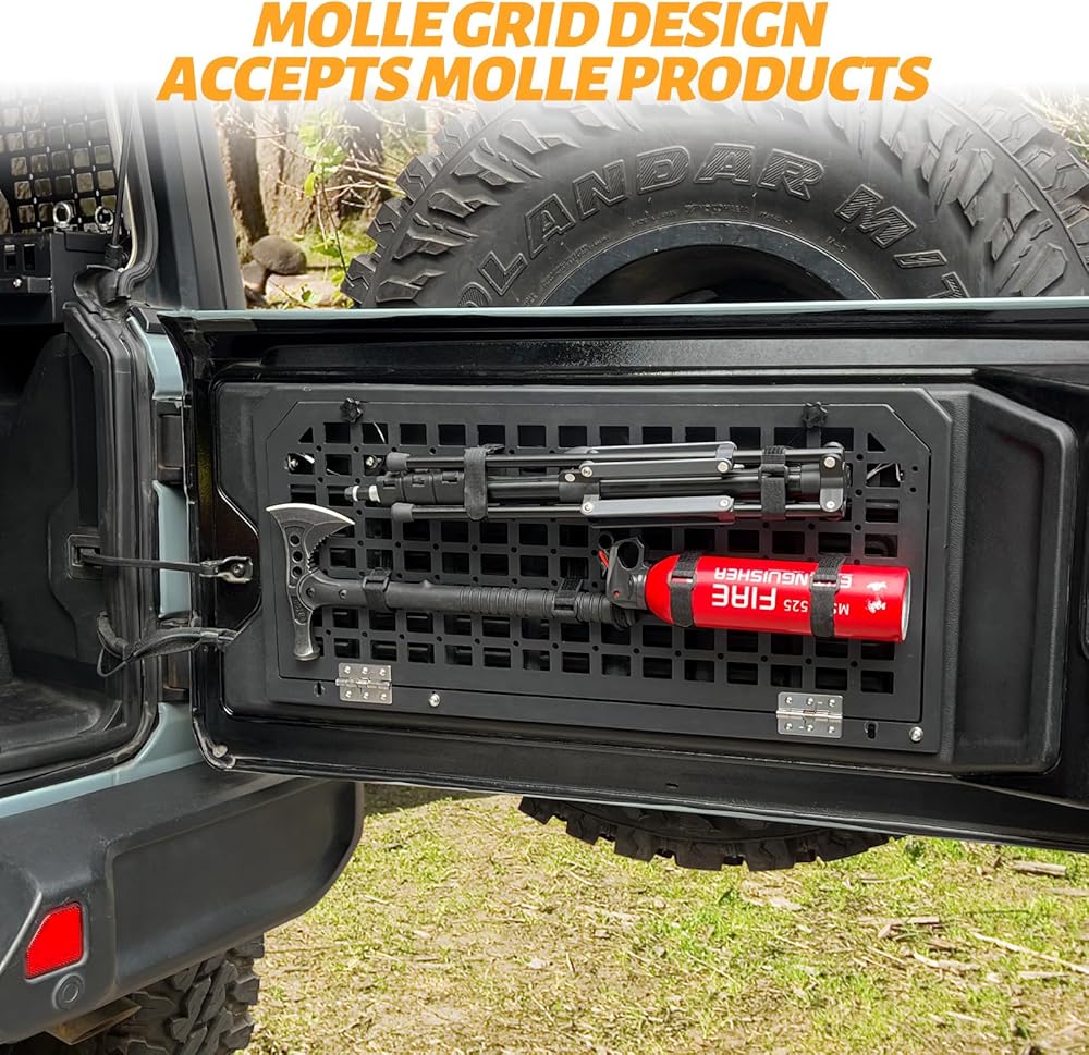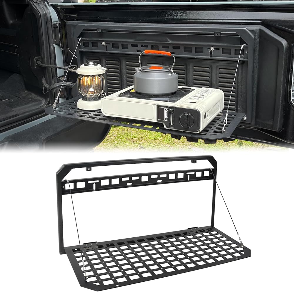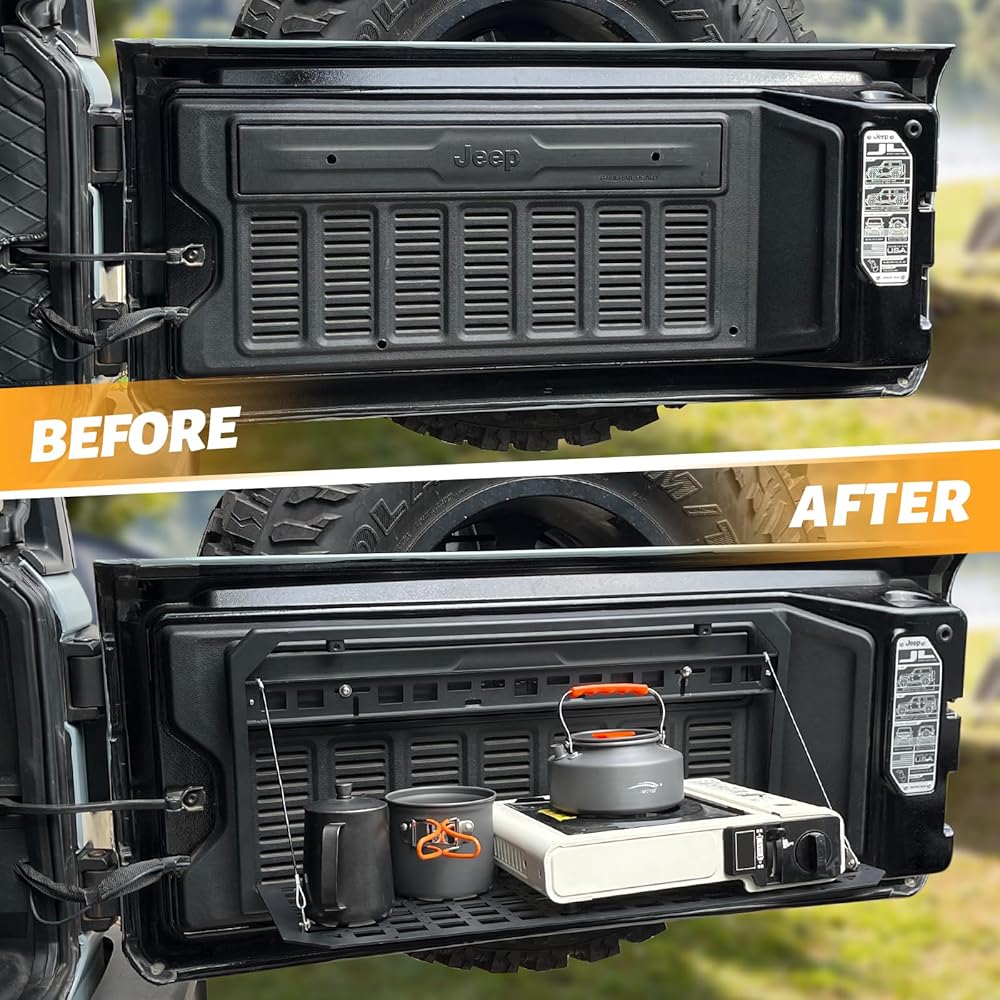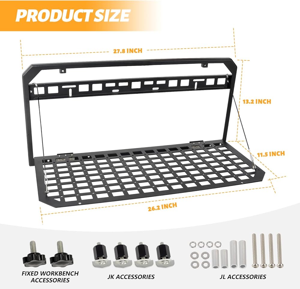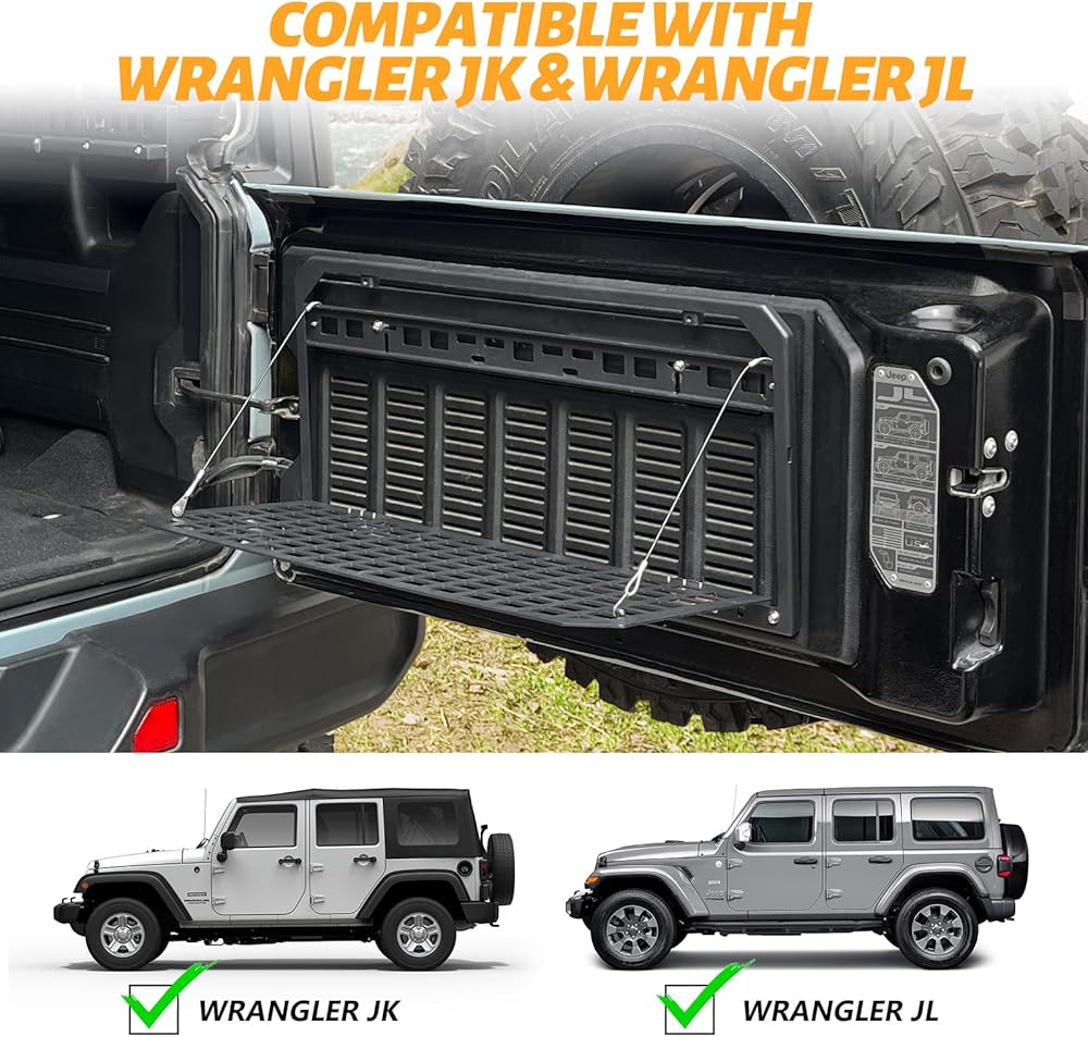 طاولة الباب الخلفي MAIKER للوحة Jeep Tailgate MOLLE لعام 2007-2024 Jeep Wrangler JK JKU JL JLU رف تخزين قابل للطي من سبائك الألومنيوم (لا تناسب موديلات JK مع مضخم صوت المخزون)
