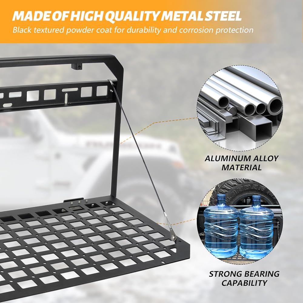 • 【مادة فائقة الجودة】طاولة الباب الخلفي مصنوعة من سبائك الألومنيوم عالية الجودة، والتي ليس من السهل تشويهها أو كسرها. مسحوق محكم مطلي لمقاومة الصدأ والتآكل. يدعم ما يصل إلى 80 رطلا.