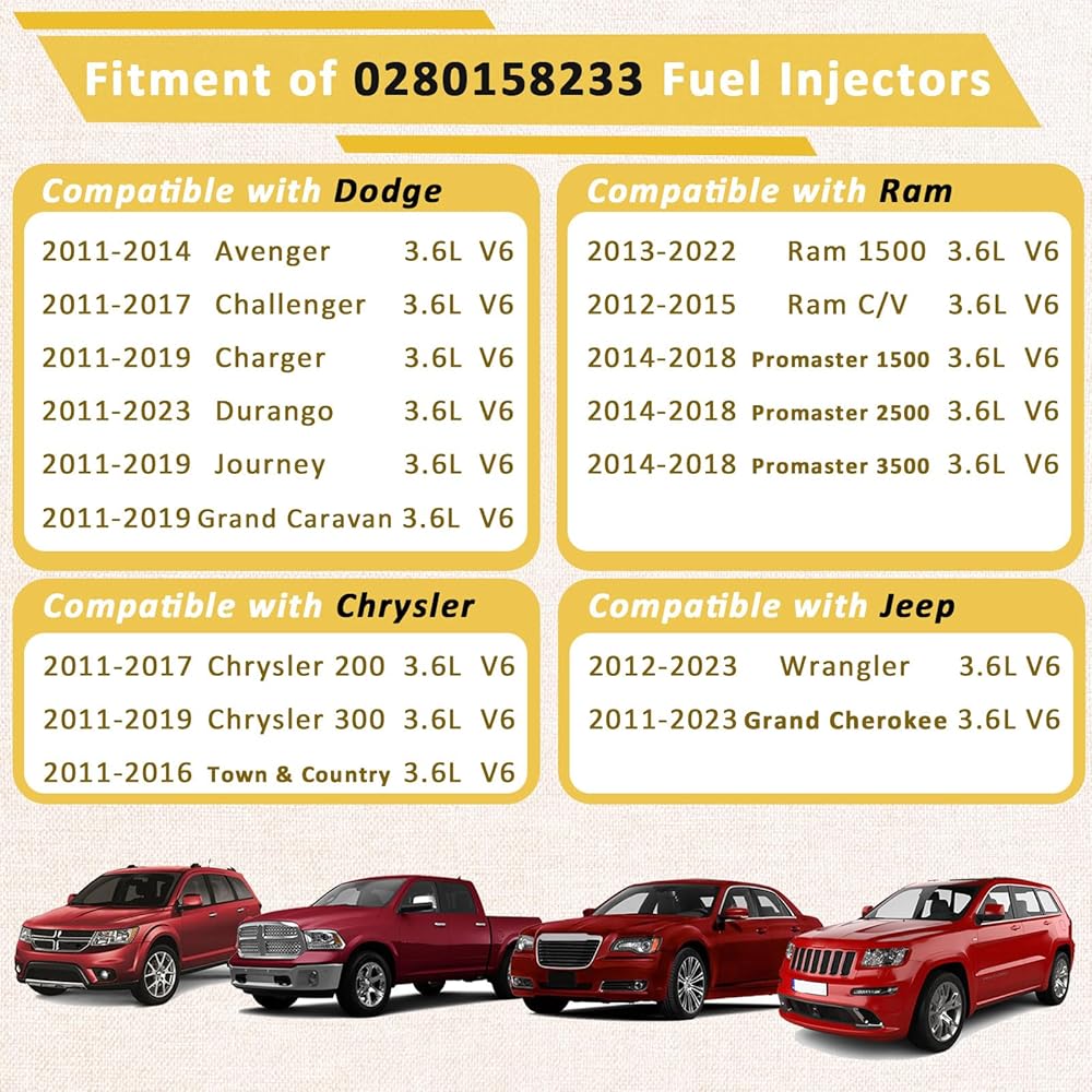 05184085AC OE 3.6L حاقن الوقود، متوافق مع/جيب 3.6 رانجلر جراند شيروكي، متوافق مع/دودج تشارجر رحلة رام 1500 دورانجو 2011 2012 2013 2014 2015 2016 2017 |4 فتحات| |مجموعة من 6|