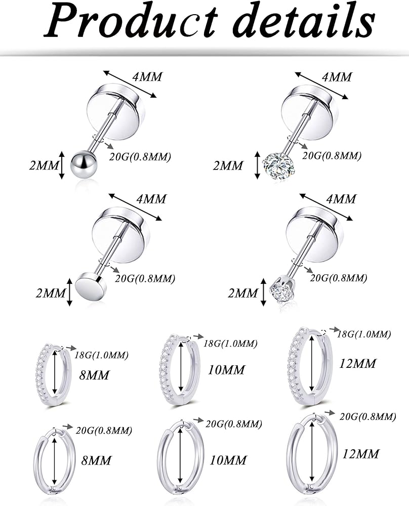 • الحجم المثالي: مقياس البريد: 20 جم (0.8 مم) - 18 جم (1.0 مم)، أقراط هوجي هوب صغيرة القطر الداخلي: 8/10/12 مم (0.3/0.39/0.47 بوصة)، قطر CZ/الكرة/النقطة: 2 مم، برغي خلفي أقراط غضروفية، سهلة الارتداء، ليس من السهل أن تسقط؛ يمكنك ارتداء الأقراط ذات الظهر المسطح بشكل مريح أثناء النوم أو العمل أو السباحة