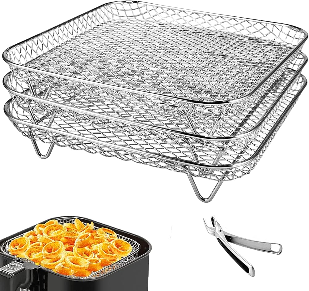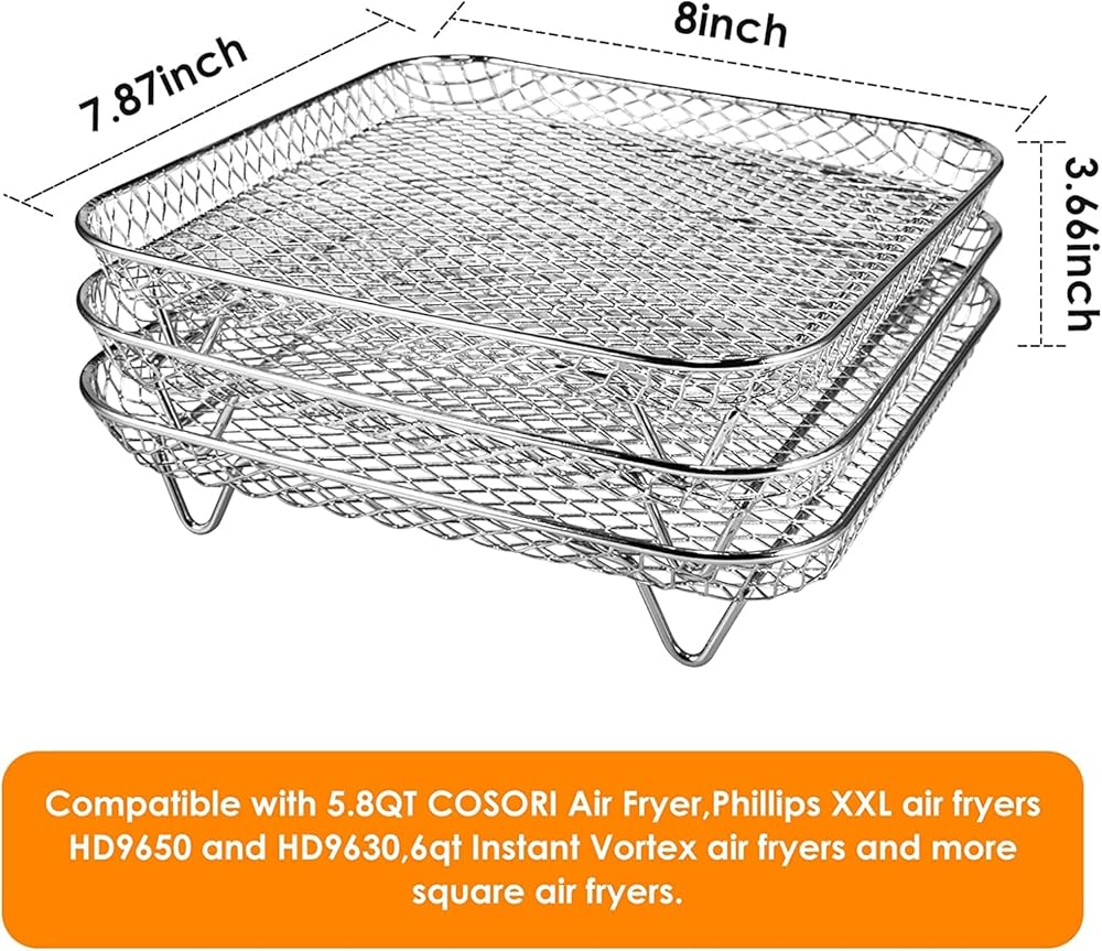 رف مقلاة هوائية مقاس 8 بوصات، 3 رف مقلاة هوائية مربع من الفولاذ المقاوم للصدأ قابل للتكديس متوافق مع دوامة فورية، فيليبس، مقلاة هوائية كوسوري، تناسب جميع ملحقات مقلاة الهواء 4.2QT - 5.8QT