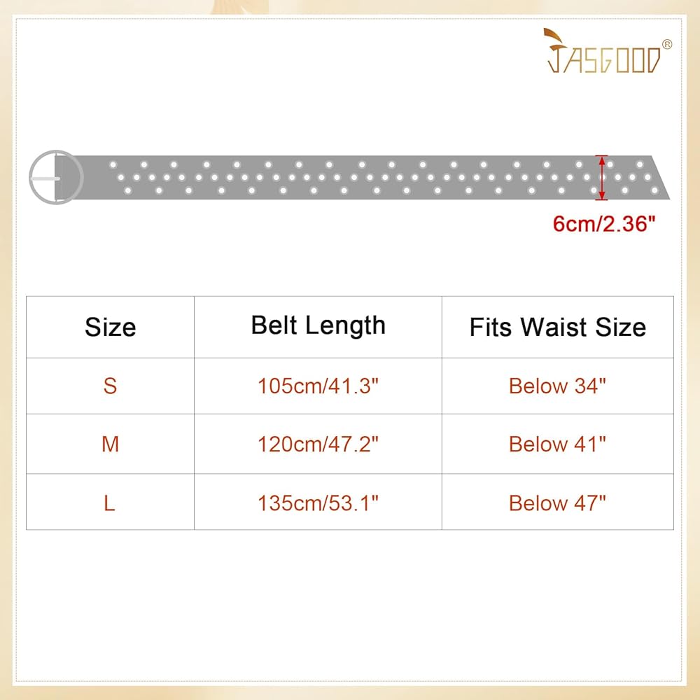 مقاس قابل للتعديل: مجهزة بعدد من الفتحات الصغيرة، الحلقة المعدنية الموجودة على حزام السيدات هذا تغطي الحزام بأكمله، ويمكن تعديل الطول بحرية وفقًا لخط الخصر الشخصي للعثور على الطريقة الأنسب لارتدائه. سواء كان الخصر النحيف أو الوضعية الممتلئة، يمكن التحكم فيه بسهولة لإظهار سحرك الفريد. عرض الحزام 6 سم/2.36 بوصة.