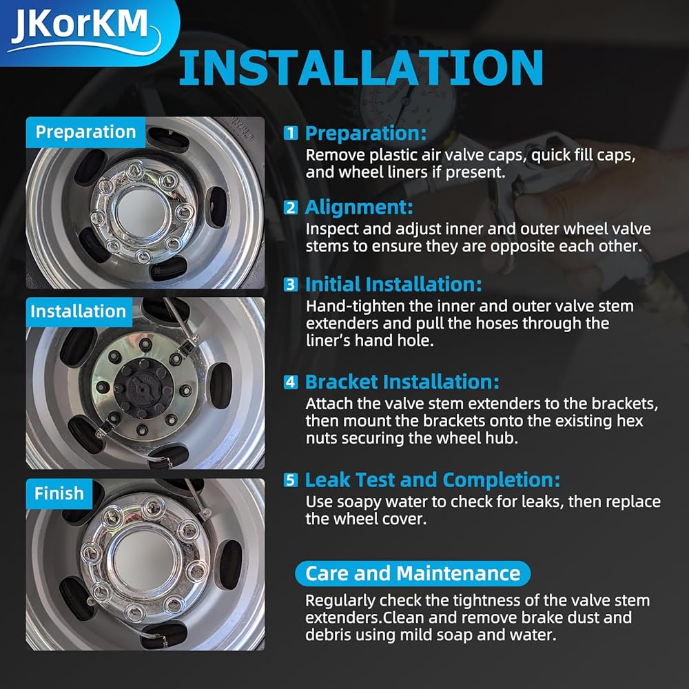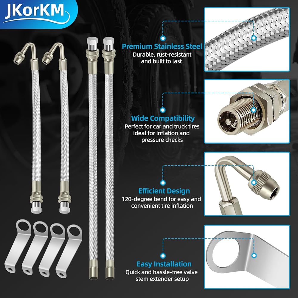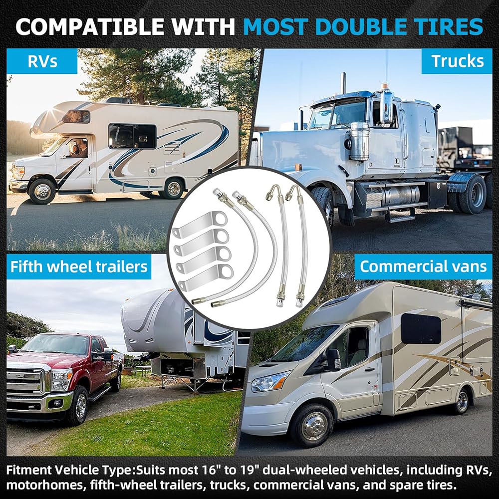 مجموعة نفخ الهواء للإطارات المزدوجة، بما في ذلك موسعات ساق الصمام وملحقات صمام الإطارات، تسهل الاتصال السهل بصمامات الإطارات والمعدات لفحص الإطارات بشكل مباشر.
