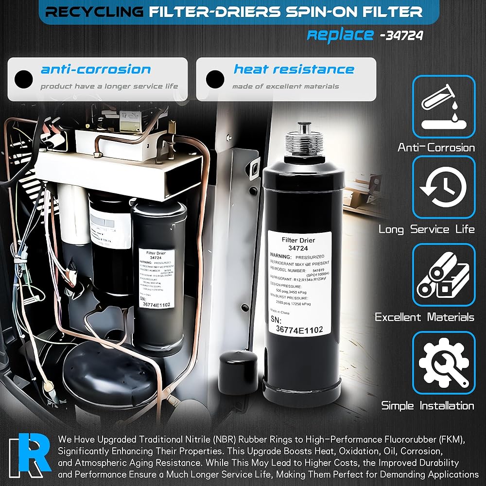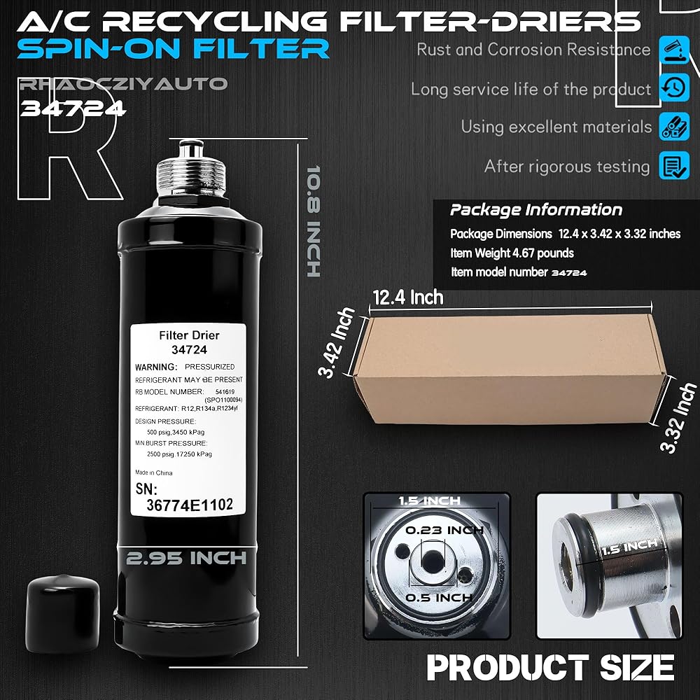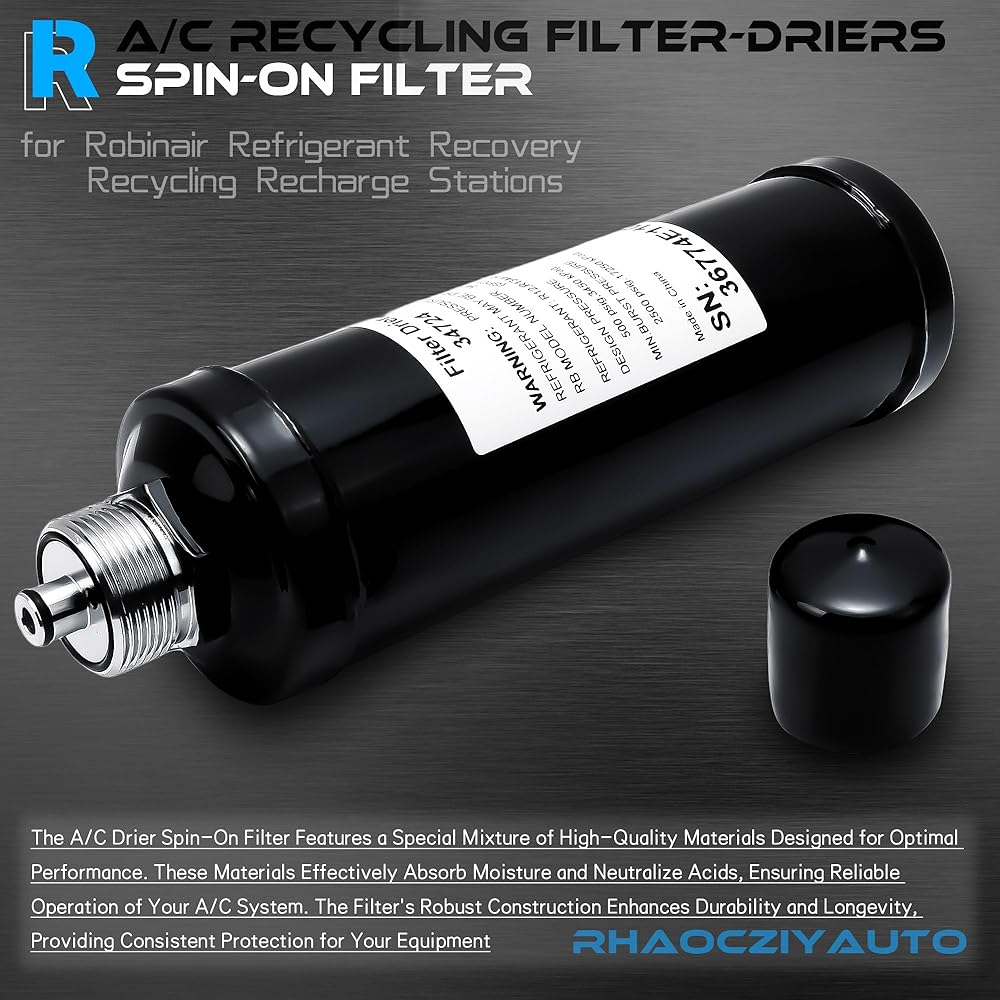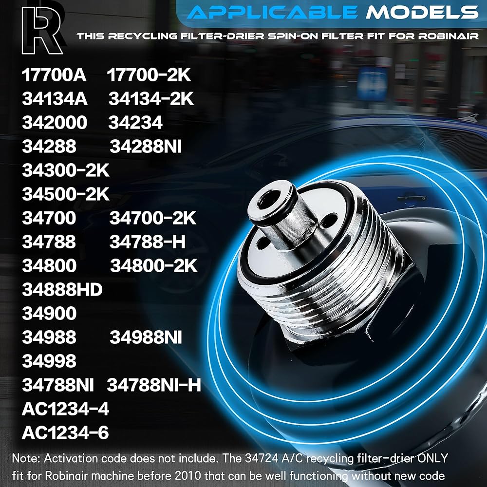 34724 A/C Recycling Filter Drier for Robinair is compatible with a wide range of old Robinaire Refrigerant Recovery Recycling Recharge Stations machines, specifically: 17700A, 17700-2K, 34700, 34700-2K, 34800, 34800-2K, 34900, 34288, 34788, 34788-H, 34888HD, 34988, 34288NI, 34788NI, 34788NI-H, 34988NI, 34998, AC1234-4, AC1234-6, AC1234-9, and similar OEM models, if you are not sure about the suitability, you can write to us NOTE: Activation code not included. The 34724 A/C recycling filter-drier fit for Robinair machine before 2010 that can be well functioning without new code