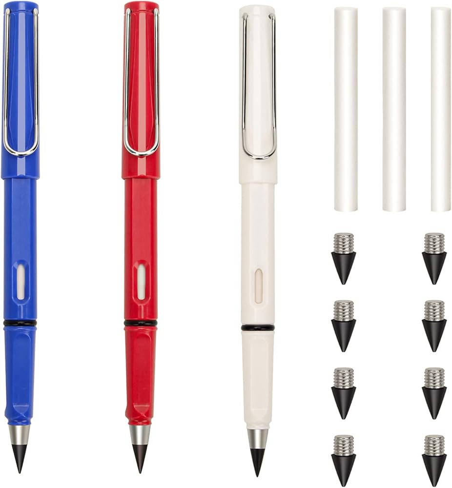 3 قطع قلم رصاص يدوم طويلاً، قلم رصاص يدوم طويلاً، رأس قابل للاستبدال، قلم لا نهائي بدون حبر، أقلام كتابة معدنية غير محدودة قابلة لإعادة الاستخدام مع 8 رؤوس أقلام