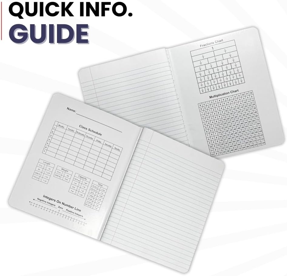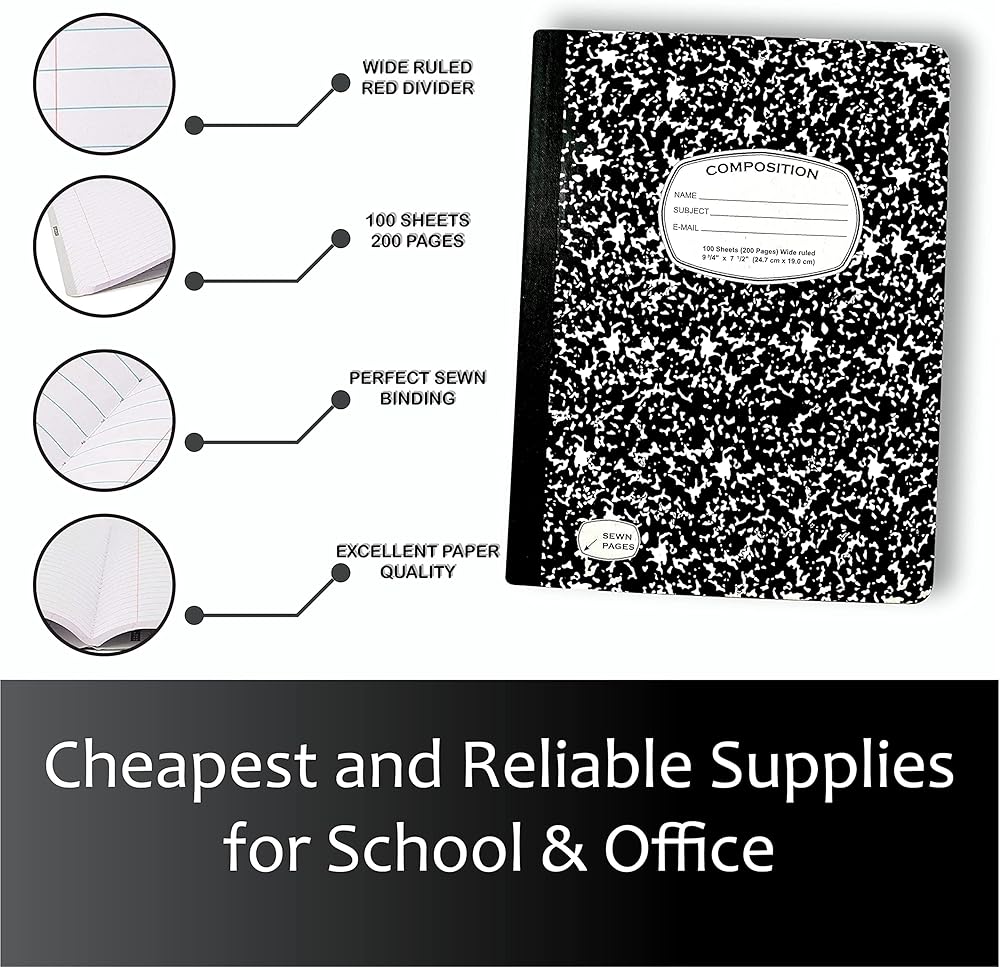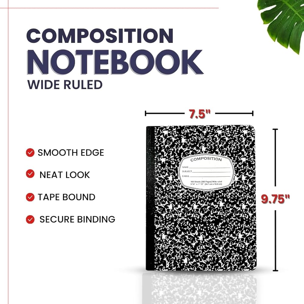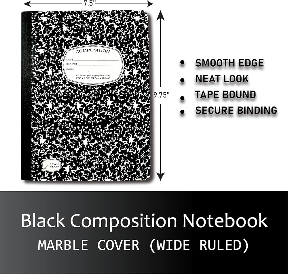• قاعدة تكوين دفتر الملاحظات العريضة جاهزة لأي مهمة. دفاتر ملاحظات رائعة للمدرسة واليوميات. يحتوي دفتر الملاحظات على أوراق دفاتر بيضاء مسطرة بعرض 9-3/4 × 7-1/2 بوصة، وغطاء رخامي أسود. يوفر الغطاء مساحة لتسجيل اسمك وفصلك وموضوعك.