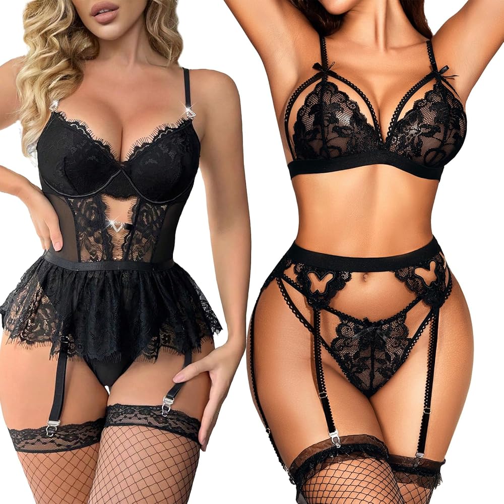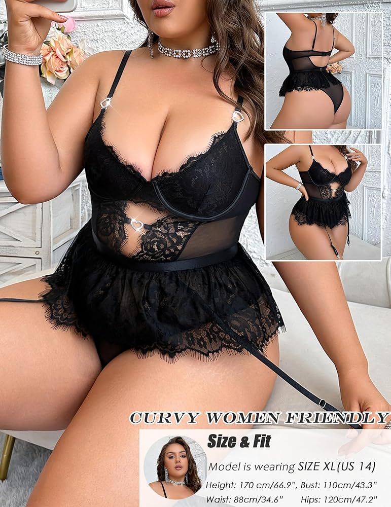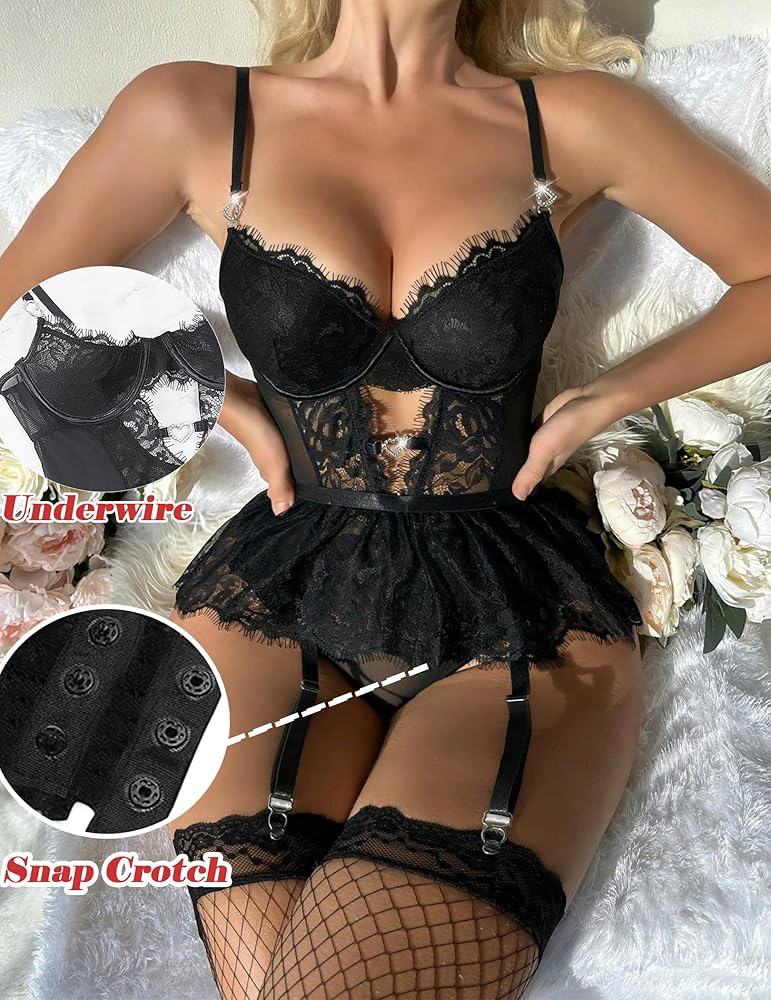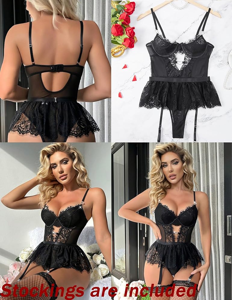 Package content: 4 PIECES including 1 x Women's Lingerie Underwired Bodysuit, 1 x Mini Lace Skirts With Garter, 1 Pair With Fishnet Stocking