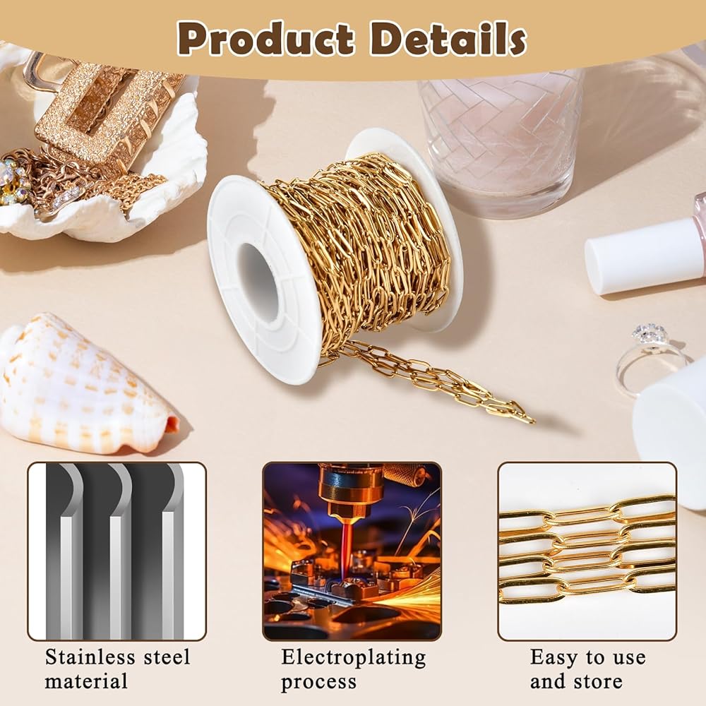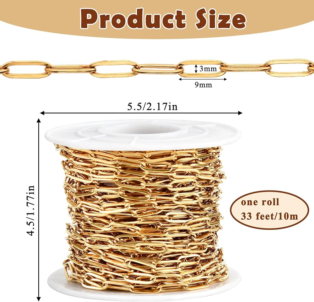 Package Contents: You will receive a paperclip chains roll, one roll size is 5.5×4.5 cm/2.17×1.77 in.The length of the chain is 10 m/33 ft,and the size of each elliptical link is 9×3 mm. You can use pliers to cut the length you want