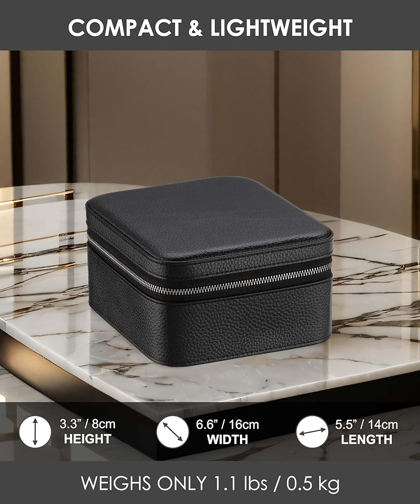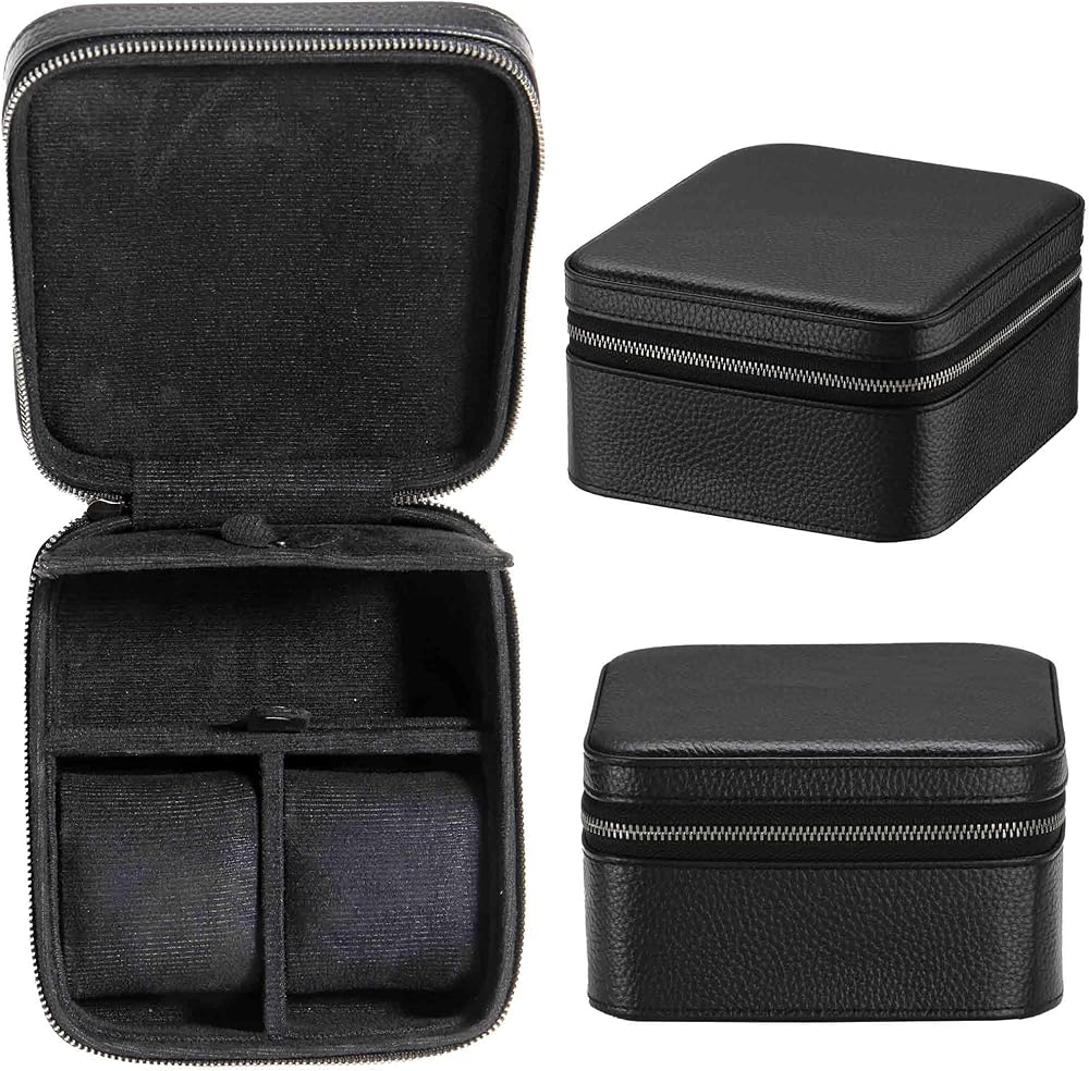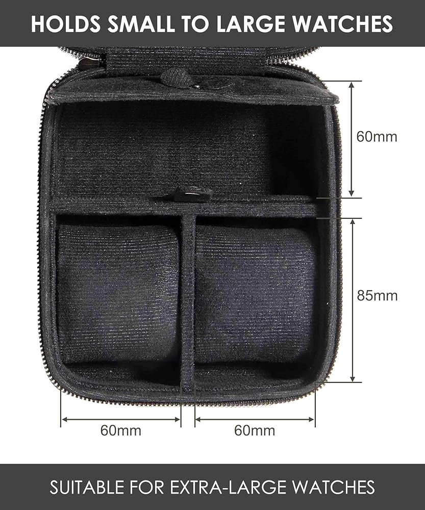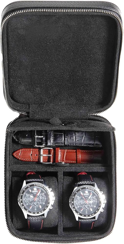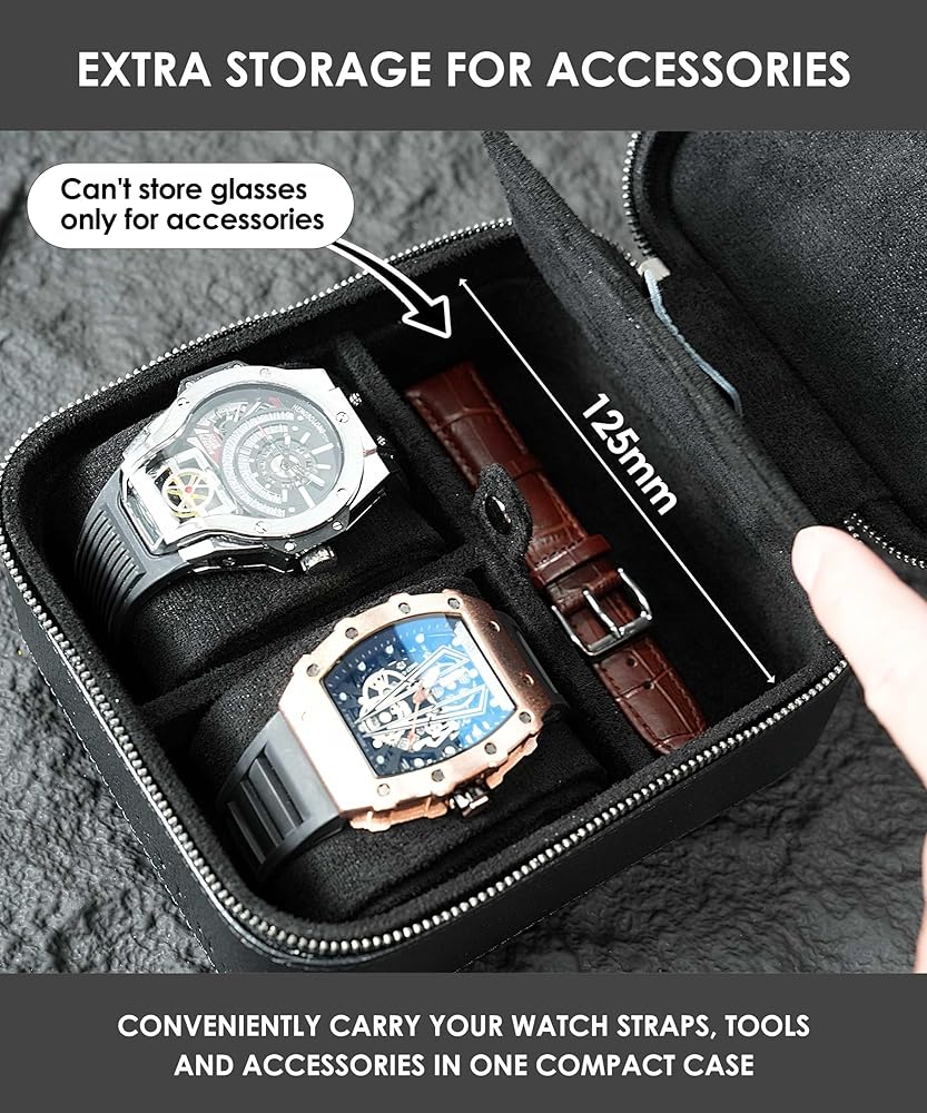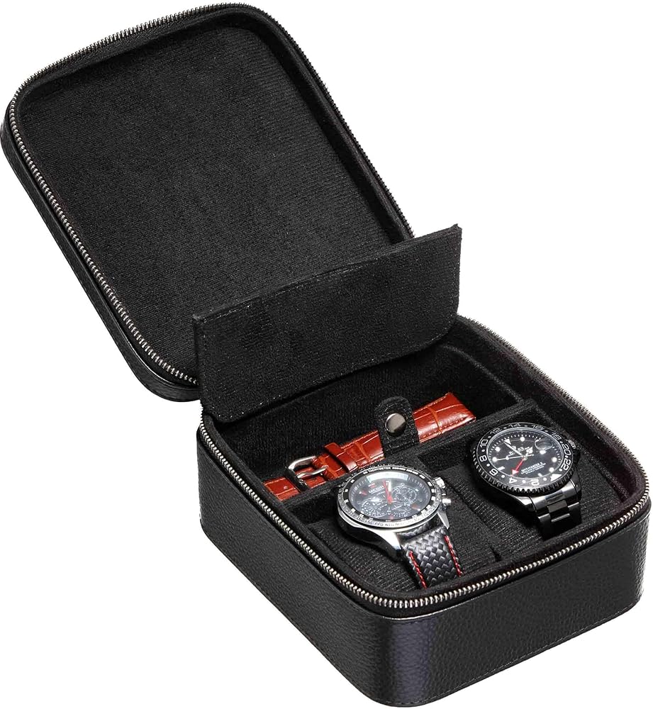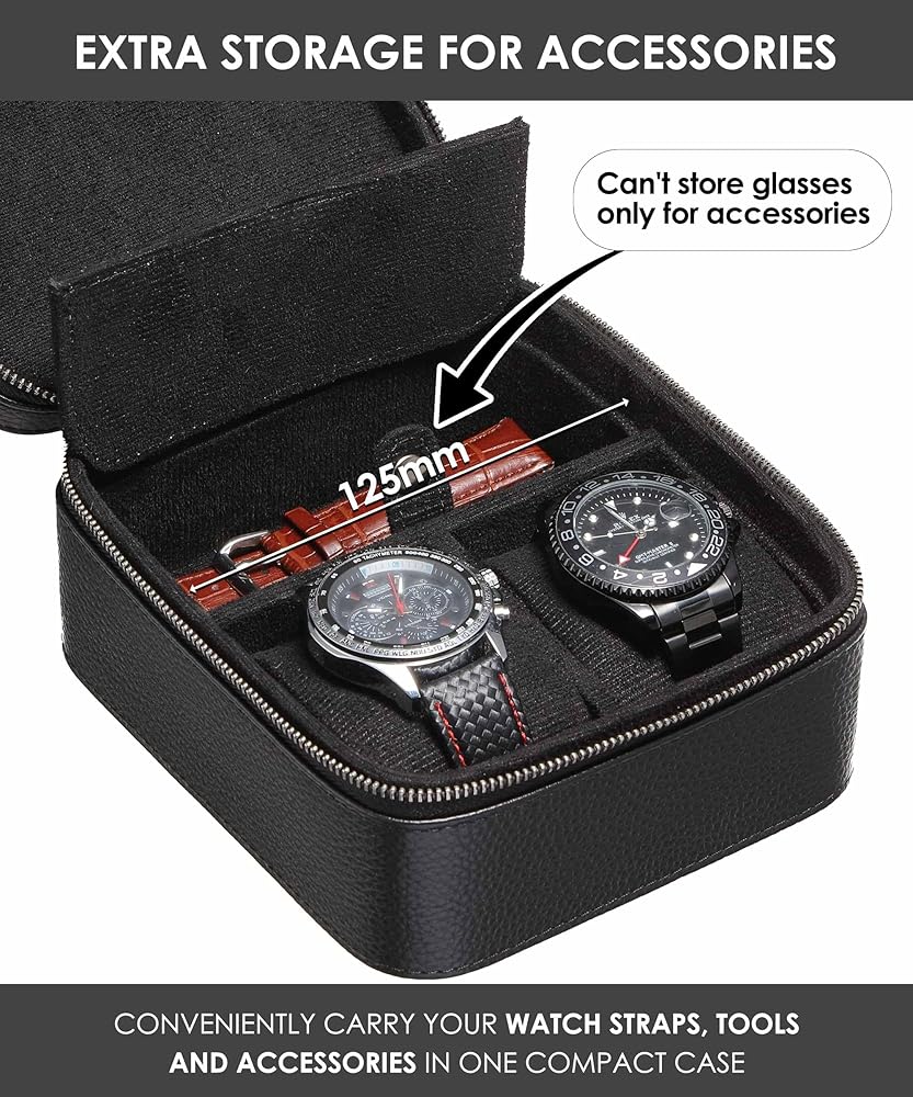 2 حقيبة سفر للساعة مع حجرة تخزين الملحقات، صندوق حمل لفافة ساعة من الجلد المحبب للرجال | سحاب حماية متين ومحمول يناسب جميع ساعات المعصم والساعات الذكية حتى 60 ملم (2+1BB)