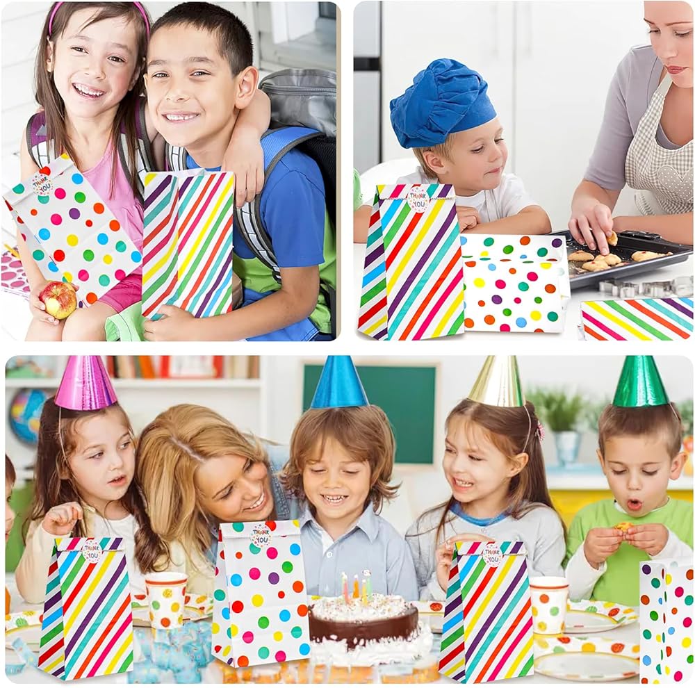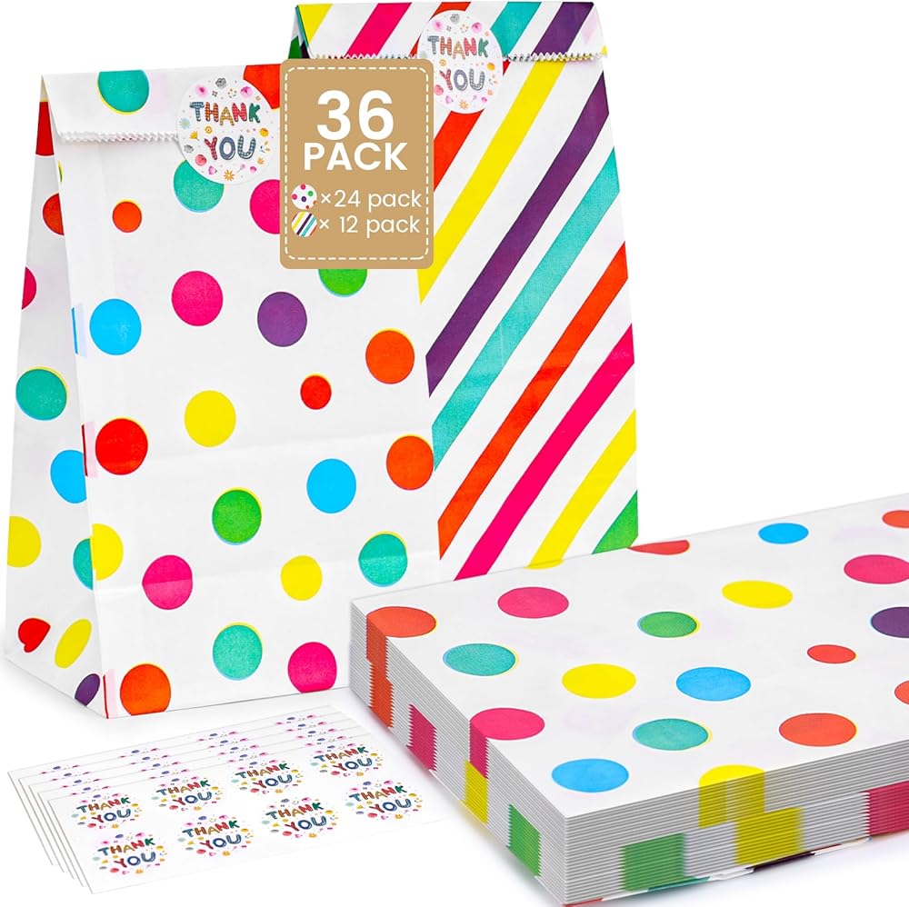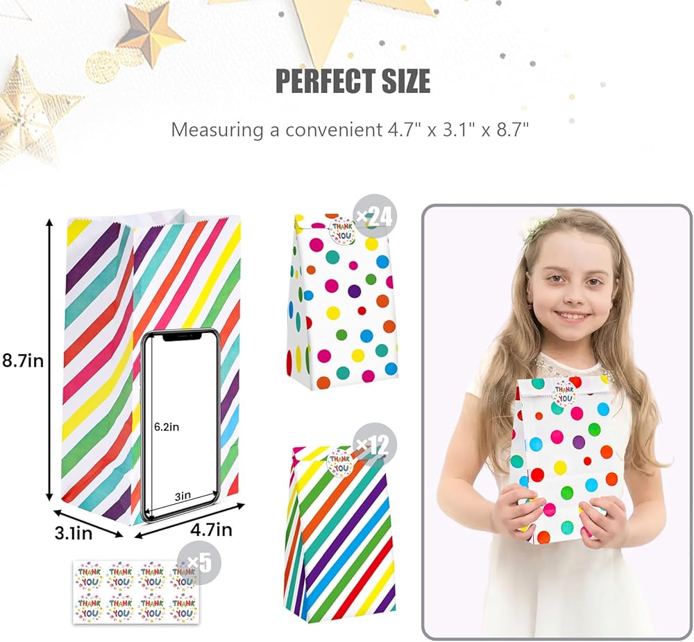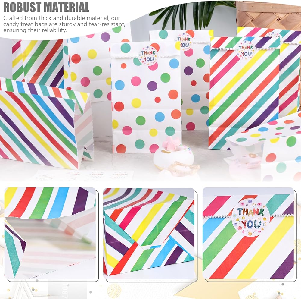 حزمة قيمة للغاية - تتضمن 12 كيس حلوى مخطط ملون، و24 كيس حلوى منقط، بالإضافة إلى ملصقات الغلق.