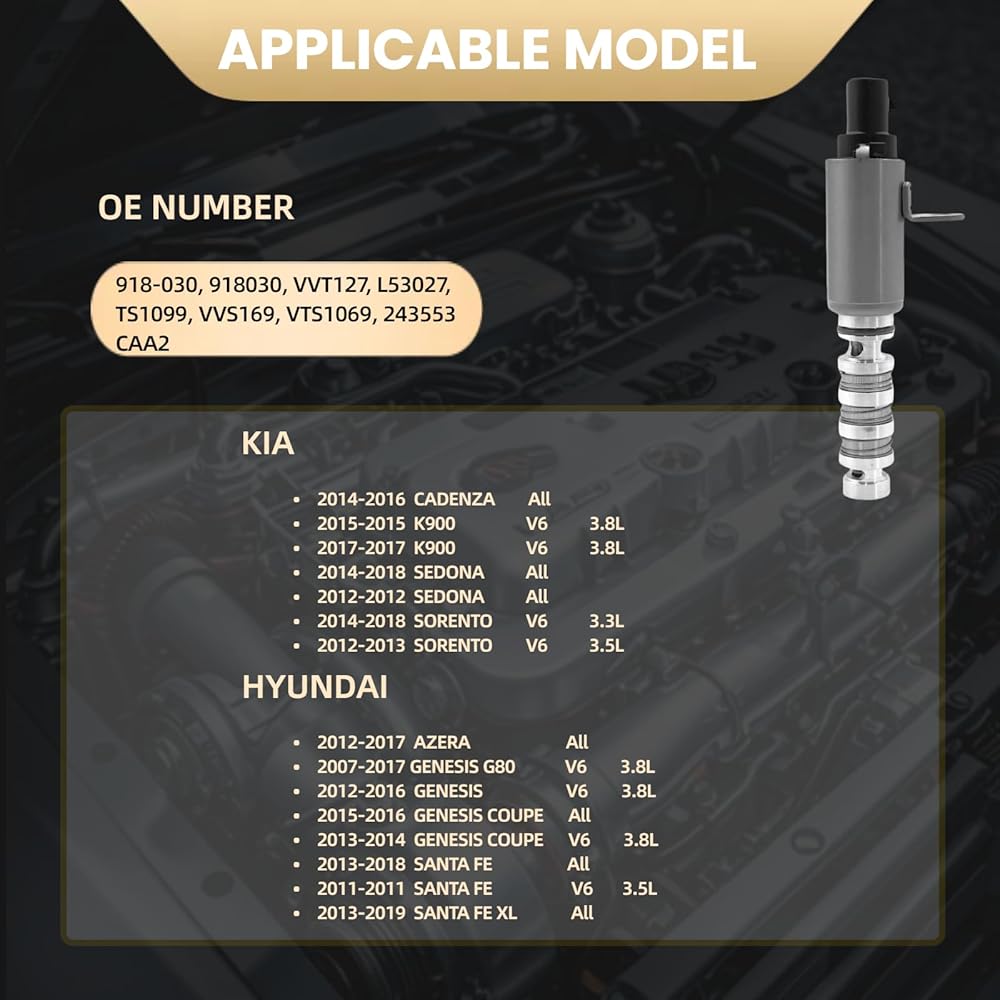 الإعداد: محرك موضع عمود الحدبات متوافق مع KIA SEDONA 2012 / 2014-2018 / SORENTO 2012-2018. الملف اللولبي لمشغل عمود الحدبات مناسب لـ 918-030، 918030، VVT127، L53027، TS1099، VVS169، VTS1069، 243553CAA2.
